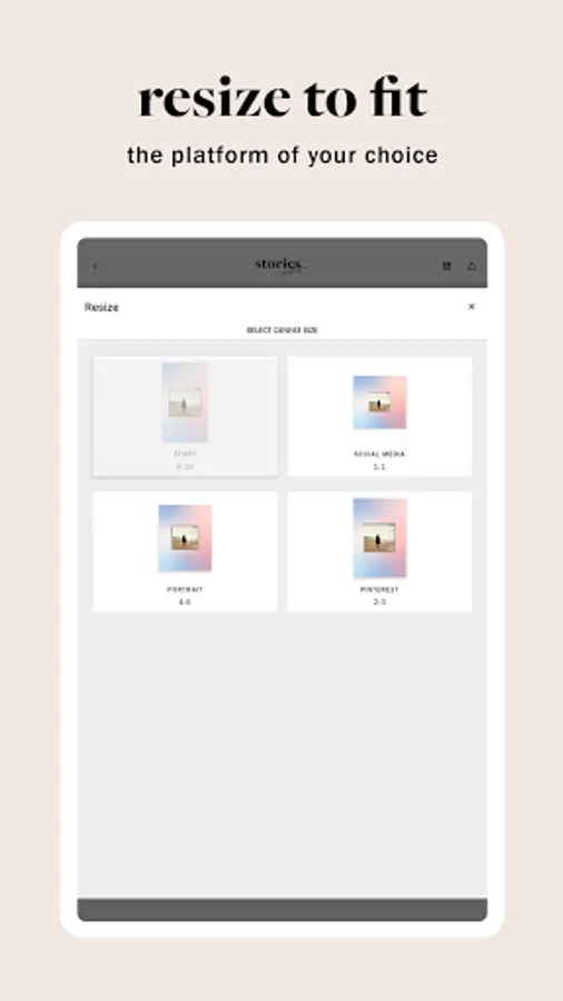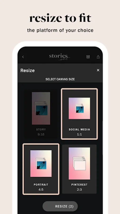 3. Resize to fit the social platform of your choice - IG Story 9:16, Social Feed 1:1, Portrait 4:5, or Pinterest 2:3.