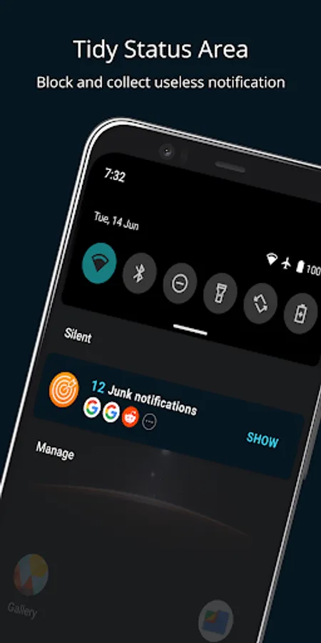 Useless notifications will be blocked smartly and collect in one place, so the phone notification bar will always be in a clean and tidy status. The app stops trash notifications from jamming and slowing down your phone, keeping your phone free from disturbing and annoying notifications.