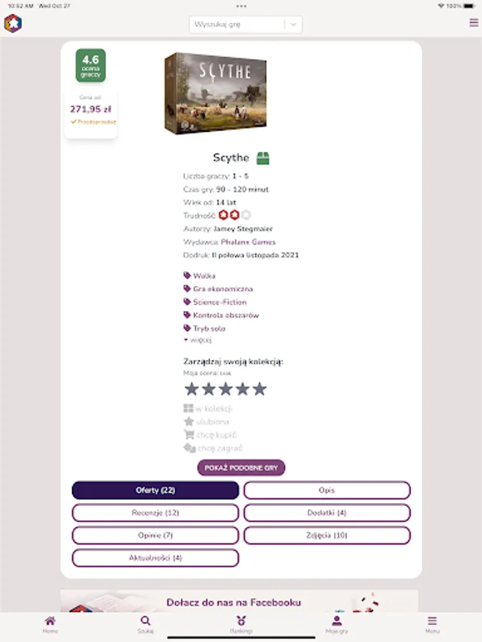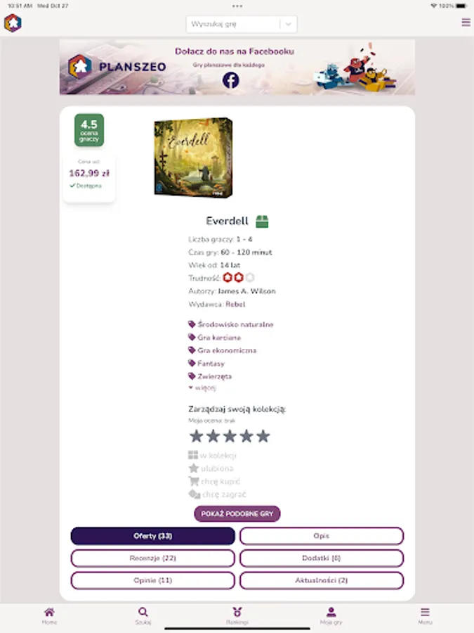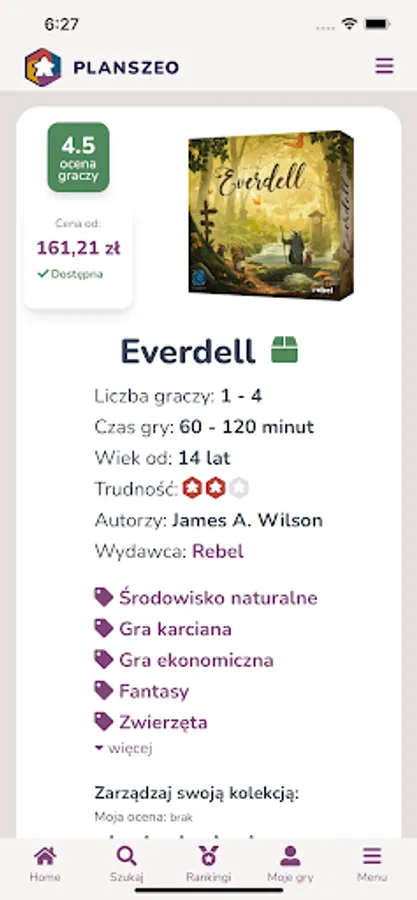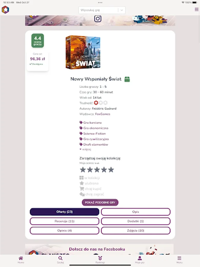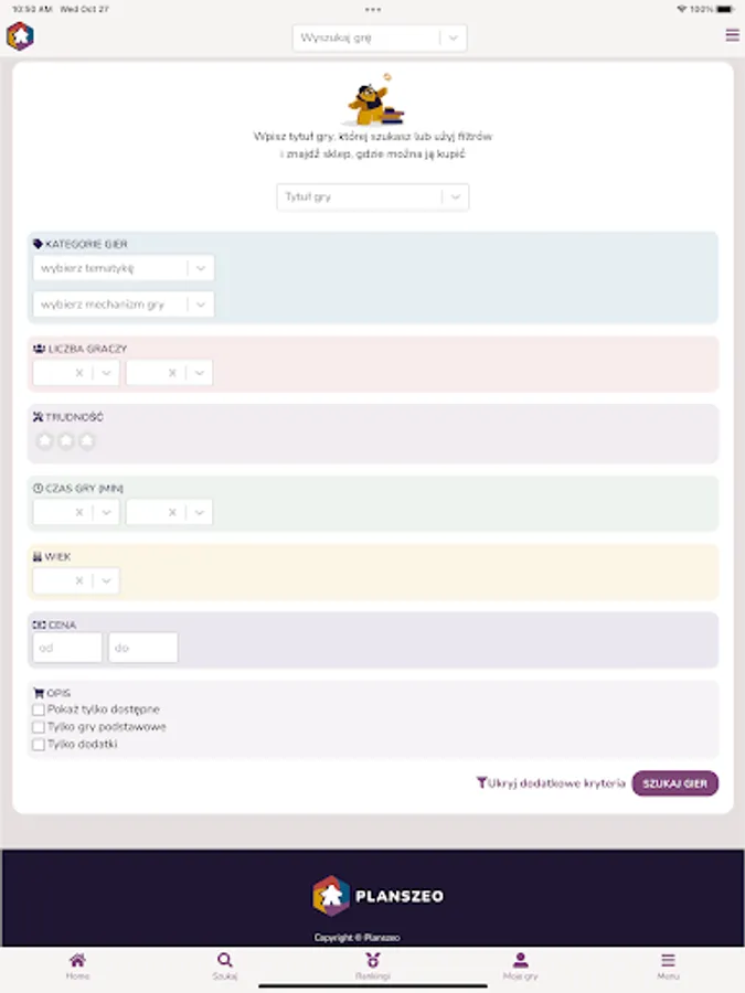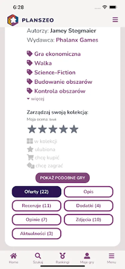 Planszeo is a database of board games with a simple search engine. The games found have all the necessary information such as ratings, opinions, reviews, photos, news, add-ons, release dates and reprints.