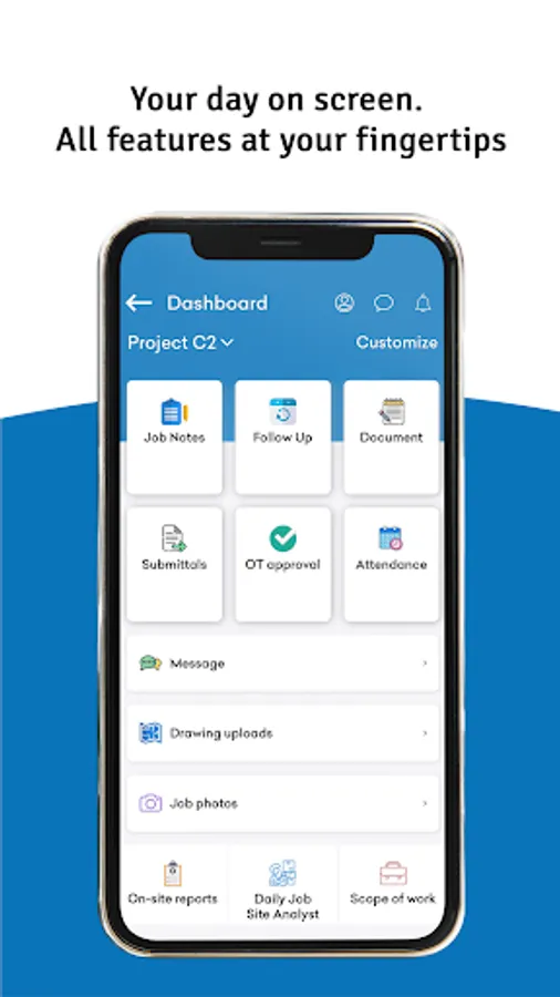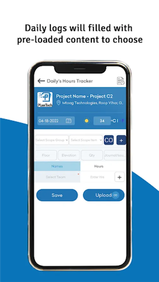 On-site reports: Upload pictures with a brief description with date, location, job title.