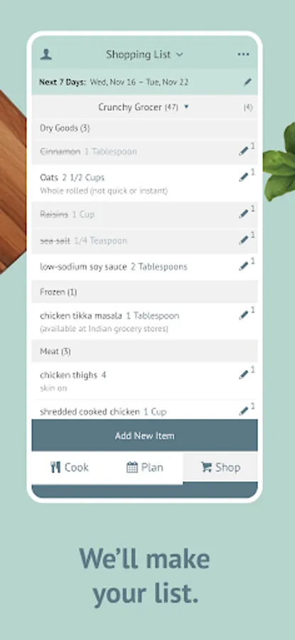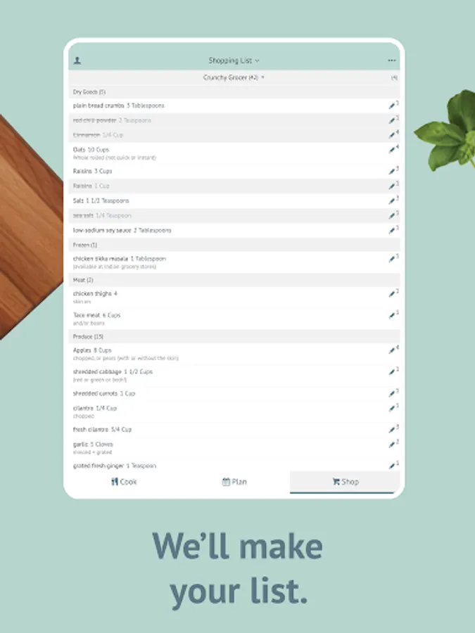 - UPGRADE YOUR SHOPPING LIST: The shopping list auto-generates an organized grocery list based on the ingredients in your meal plan. You can also add extra items to your list, add frequently purchased items from the staples list, customize and re-order your list categories, and create lists for specific stores.