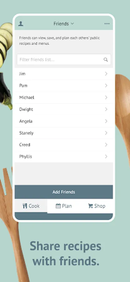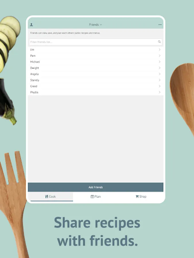 - SHARE WITH FRIENDS: Connect with friends and family to share recipes and saved menus, or send a recipe by text or email.
