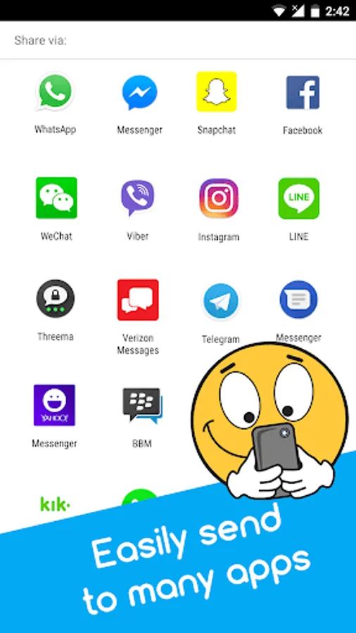 Enjoy 1000 most popular emoticons and smiley faces from our Ochat collection - free! Quickly send our unique emoji for Android as emoji for Facebook, emoticons for WhatsApp, stickers for Snapchat, emojis for texting and many other messengers.