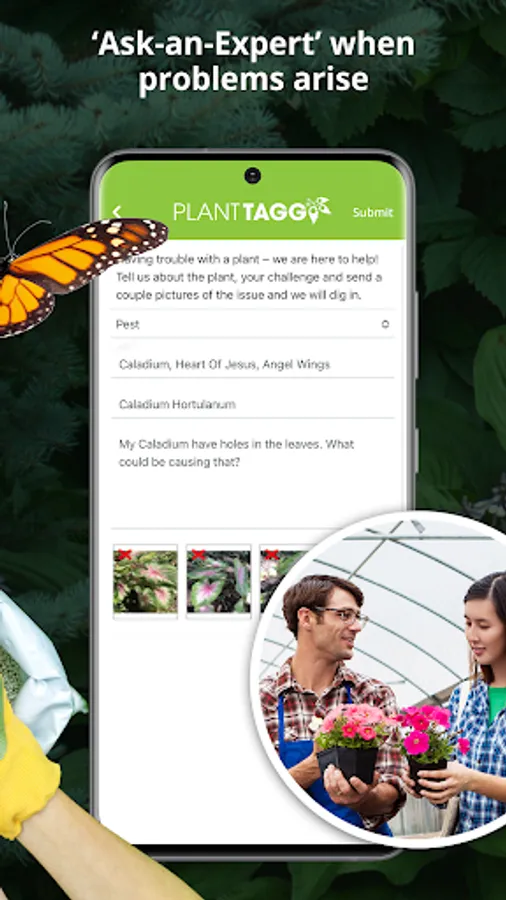 Having plant care challenges? If you are affiliated with a PlantTAGG garden center partner you will be able to 'Ask an Expert' by sending pictures and quickly receiving expert guidance.