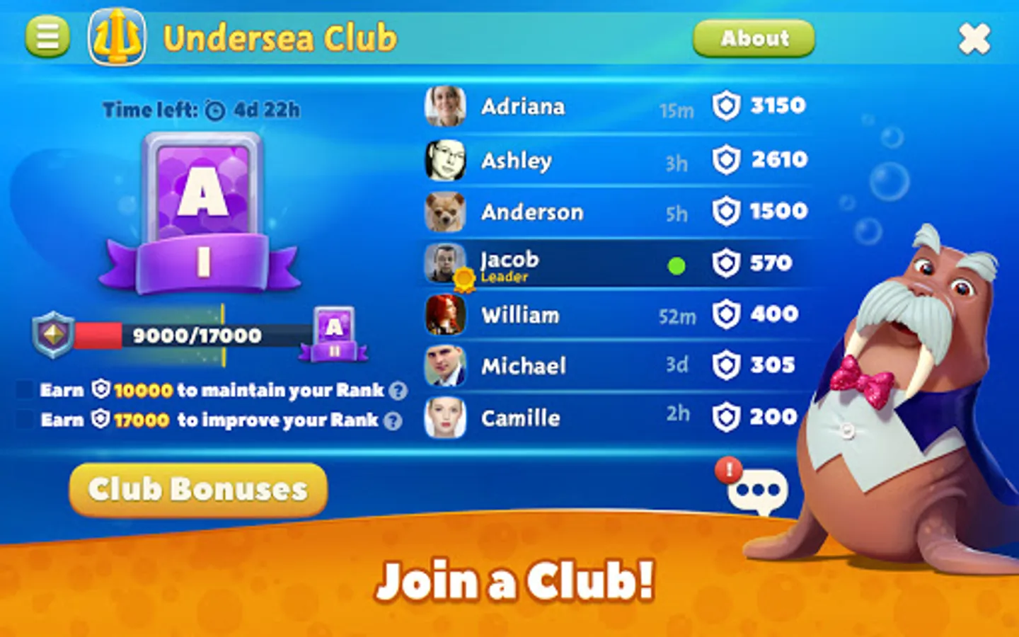 ♠ Join a Club and work with fellow members to earn cool bonuses;