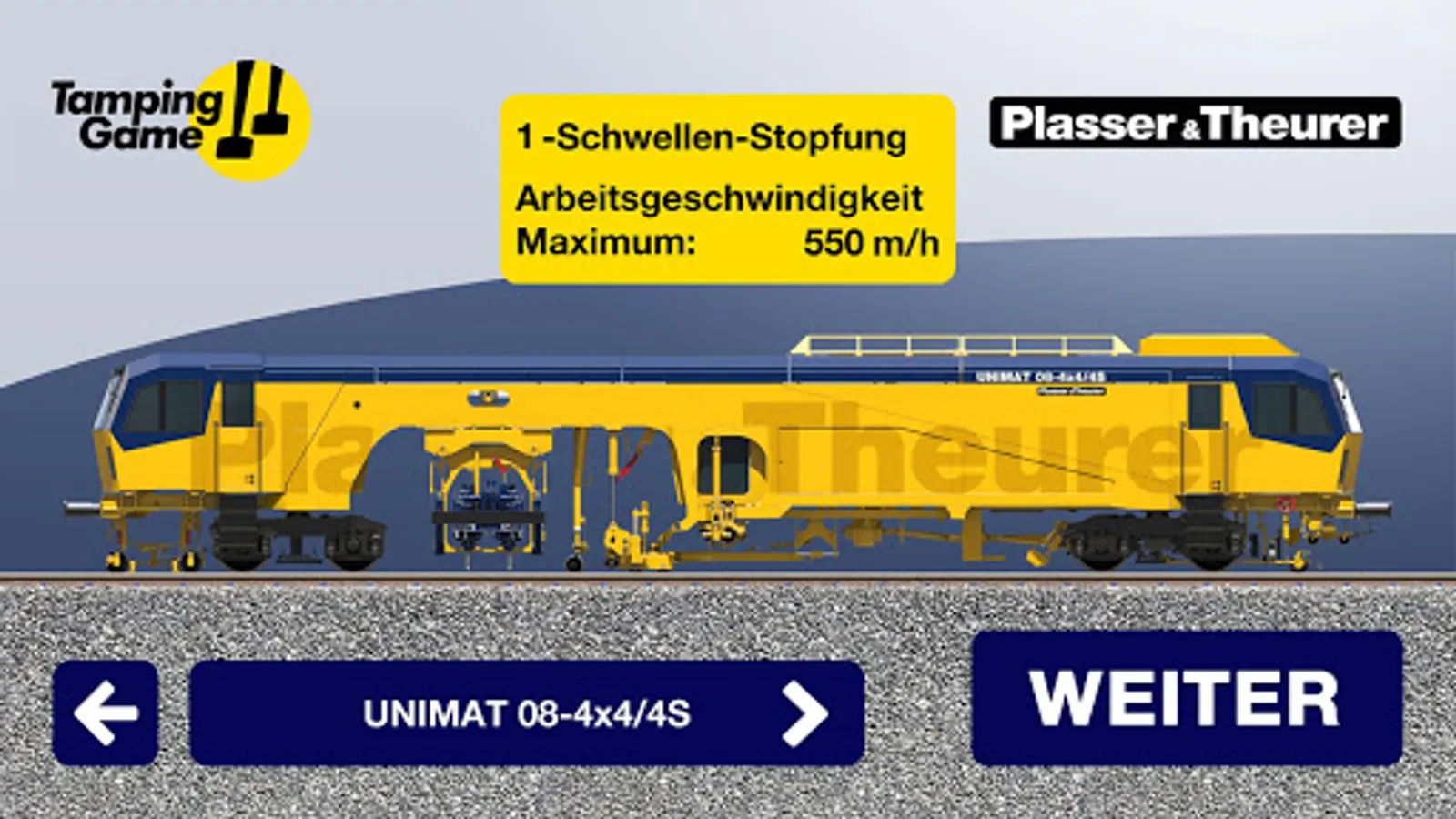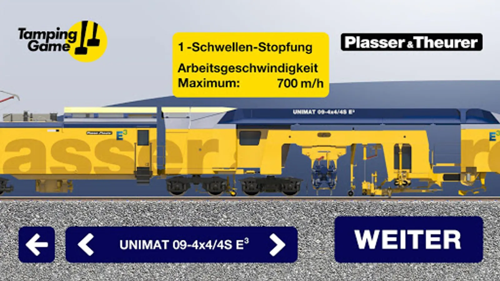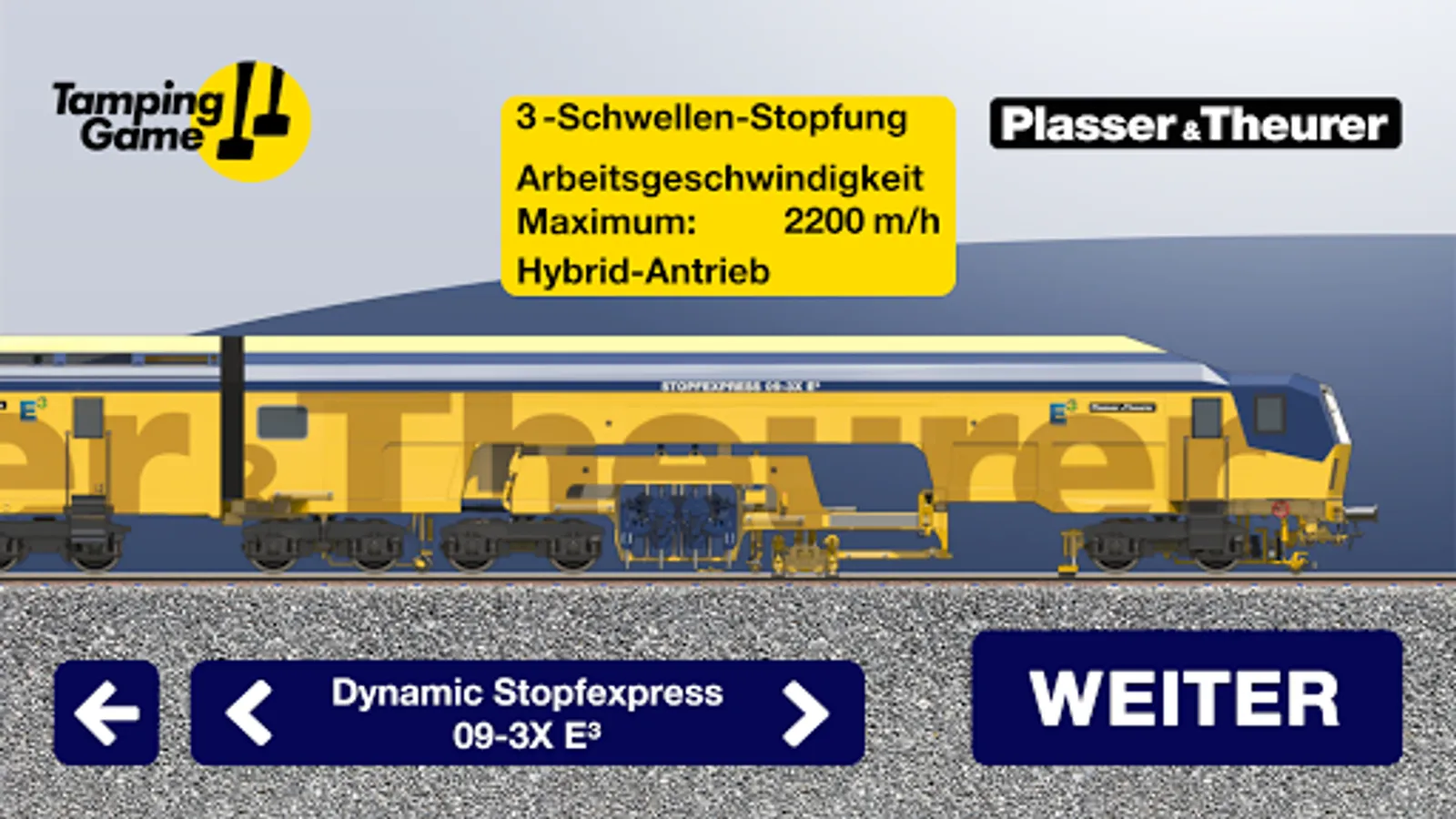 Have you always wanted to operate a tamping machine? Get to know the Plasser & Theurer machines Unimat 08-4x4/4S, Unimat 09-4x4/4S E³, Dynamic Tamping Express 09-3X, 09-3X E³ Dynamic Tamping Express and Duomatic 09-2X. In three different scenarios you will encounter a variety of obstacles. Improve your skills as you try to tamp each sleeper without any mistakes. As you improve, you will collect more points and increase your personal ranking. Check online to see your current position and to compare it to that of other players.