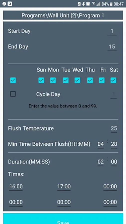 o Pre-defined schedule of flushing by growing days, either according to specific days of the week or flushing schedule per number of days from last flushing. Scheduling allows up to 6 flushing activation's per day and in addition 5 different schedules may be defined to reflect different ages by growing days.