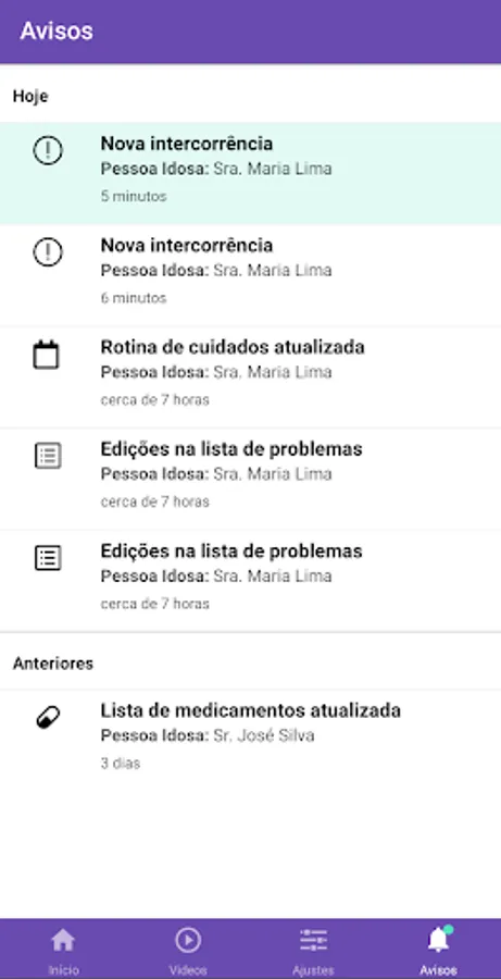 The information recorded by health professionals reflects on the care of the dependent elderly person, as the necessary information for daily care by caregivers/family members is generated. In this way, the applications (Health Professional and Caregiver/Family Member) work in an integrated manner, generating relevant data in the context of the health of the elderly.