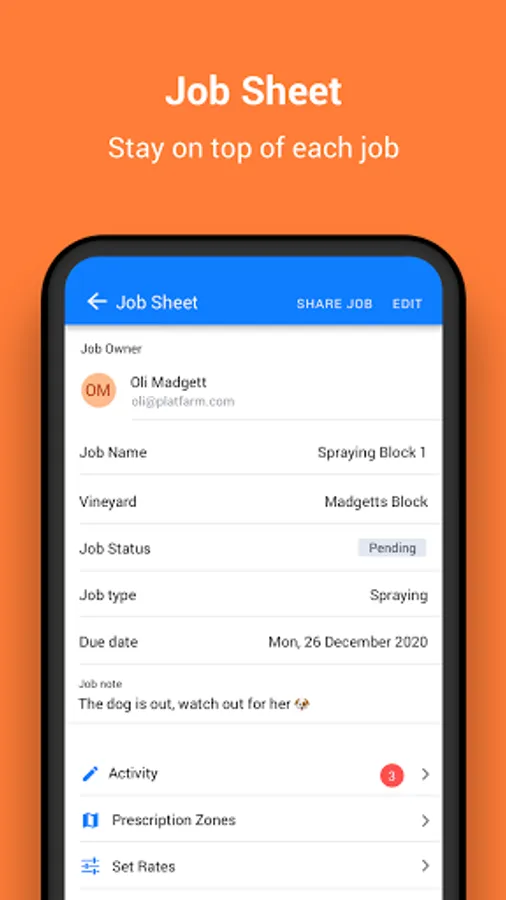 Platfarm puts the tools in your hands to build accurate digital maps of your property, down to the vinerow. With this map you can create and share jobs, directing work on your property via the familiar interface of a mobile phone or tablet.