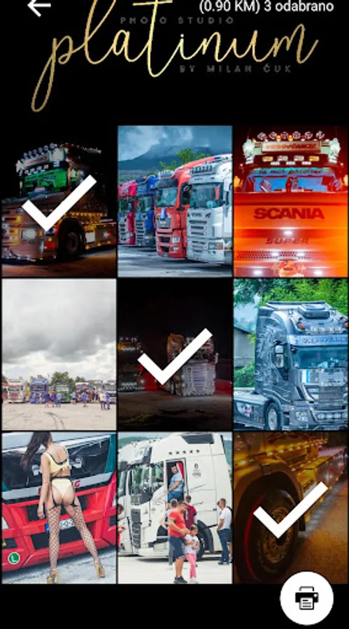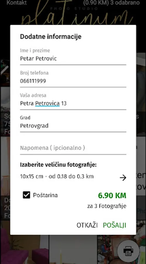 Nakon što otvorite aplikaciju, otvoriće Vam se prozor na kojem možete da odaberete format fotografija. Nakon što isti izaberete, aplikacija Vas odmah prebacuje u galerije na telefonu da bi izabrali fotografije za izradu. Dok birate fotografije u gornjem desnom uglu možete odmah da vidite koliko ste fotografija izabrali , a ujedno pored toga, pisaće Vam trenutna cijena fotografija. Nakon što odaberete fotografije, kliknite na malu ikonu štampaša u donjem desnom uglu. Kada to uradite pojaviće se prozor u koji treba da unesete svoje lične podatke .