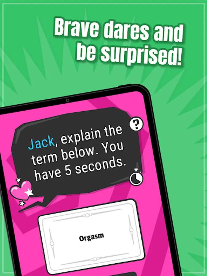 - NEW CATEGORY: Erotic. Tickling questions and tasks in three different difficulty categories. Discover new perspectives from other players and experience unforgettable challenges together. Challenges lead you and the players from innocent questions to once-in-a-lifetime experiences.