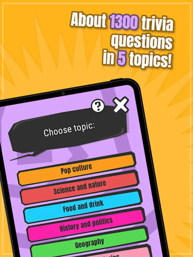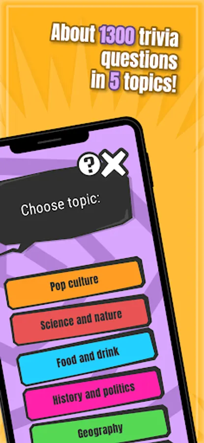 - Quiz-category: Ask others quiz questions. Subject areas: "Pop culture", "Science and nature" and "Food and drink".