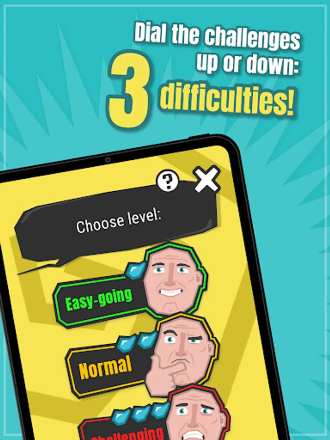 - Two difficulty levels: Easy-going and Normal. Questions and task from fun to challenging.