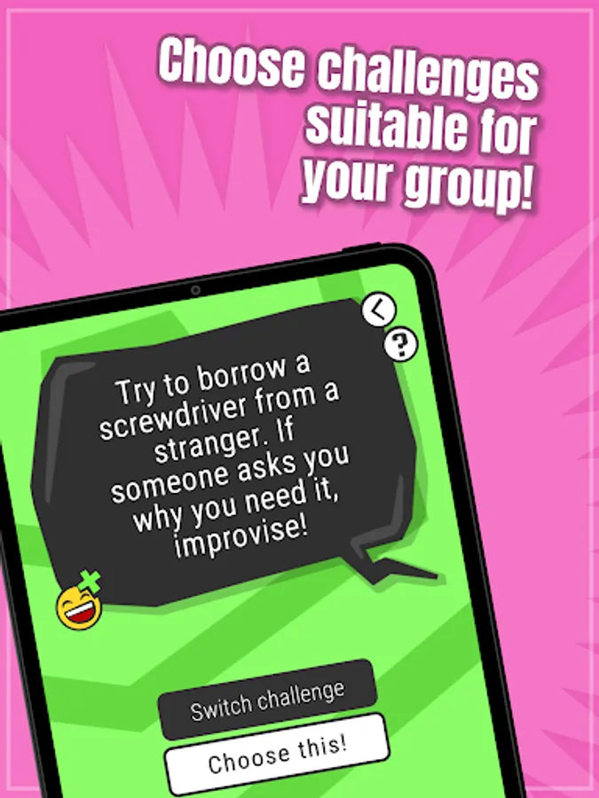- NEW CATEGORY: Public spaces. These challenges are designed to involve people outside the players' group in an exciting way. You can play this category in a public place where there are other people.