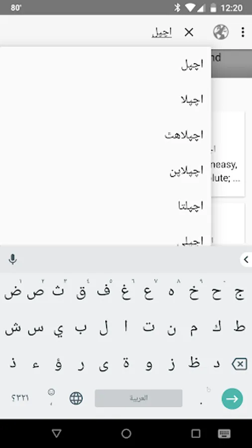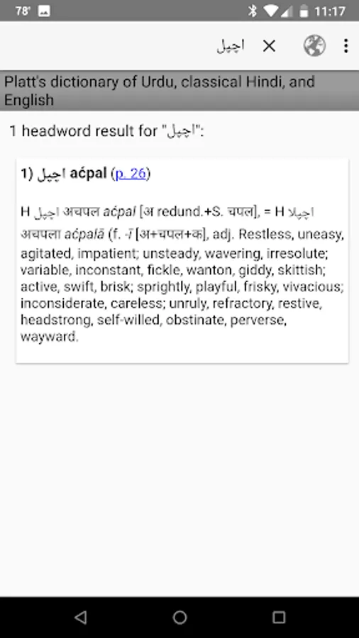 The default mode for this app is to search headwords. To search for a headword, touch the search box at the top (magnifying glass icon) to expose the on-screen keyboard and begin searching. Headwords can be entered in Perso-Arabic, Devanagari, accented latin characters, and unaccented latin characters. For example, headword searches for ستوده, सुतोतला, sitūda, and situda all yield the definition "Praised, celebrated."