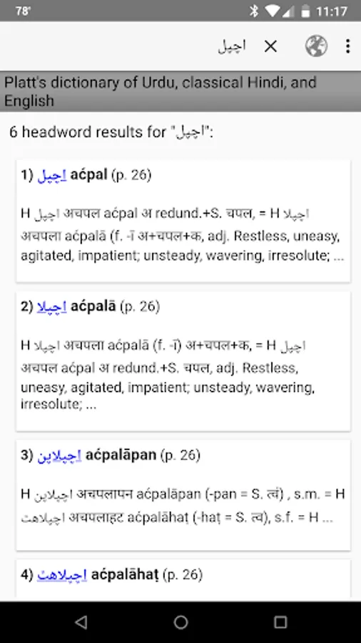 Search results come first in a numbered list that displays the Urdu headword, the accented latin transliteration of the headword, and a chunk of the definition. To see a full definition, touch the headword.
