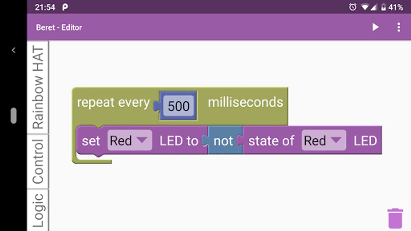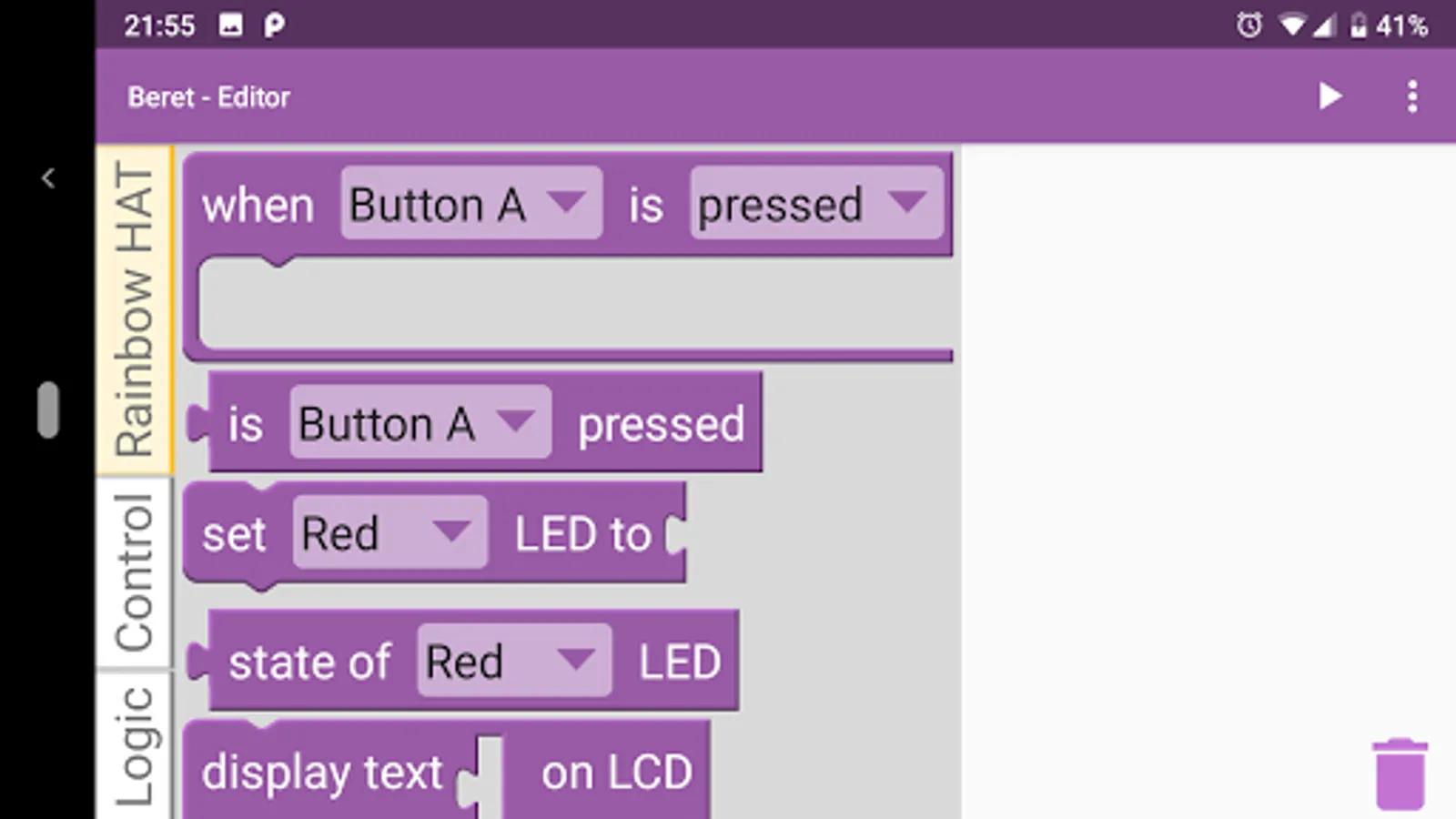 Beret is an educational project to program the Rainbow HAT on Android Things direcly on the device built on Blockly (which is a library from Google for building beginner-friendly block-based programming languages)