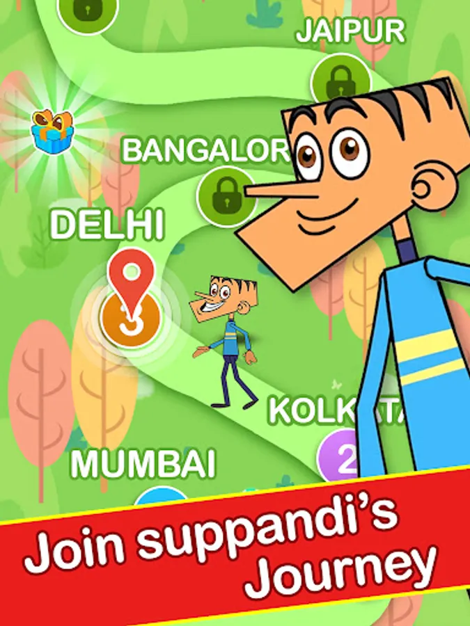 Meet and Greet Suppandi in his adventure of the Word game journey by words connect, the perfect word game trivia to solve tricky riddles and quiz which will help suppandi in his word journey in the tinkle wala game.