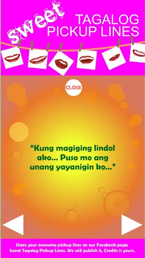 Visit us at our facebook (search for SWEET TAGALOG PICKUP LINES) page and share your awesome pickup line if you have one, we will publish it. The app will be updated regularly. Credits will be given to you and will appear at the end of the "pickup line".