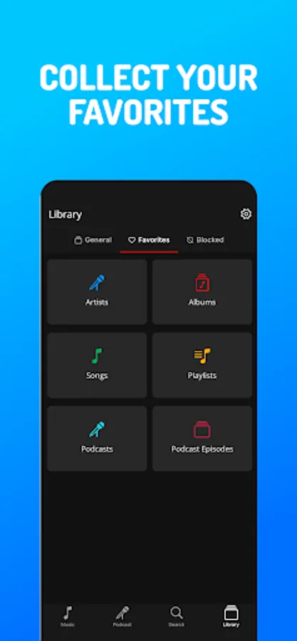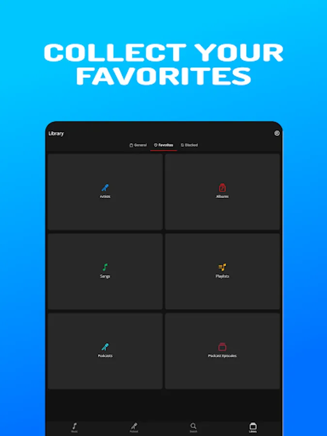 • Add songs, artists, albums, podcasts and podcast episodes to your Library