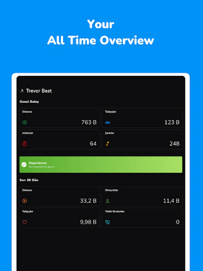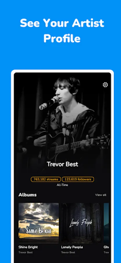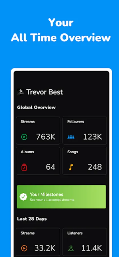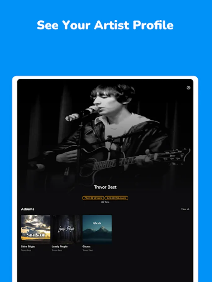 • View your real time statistics about you, your albums and songs.