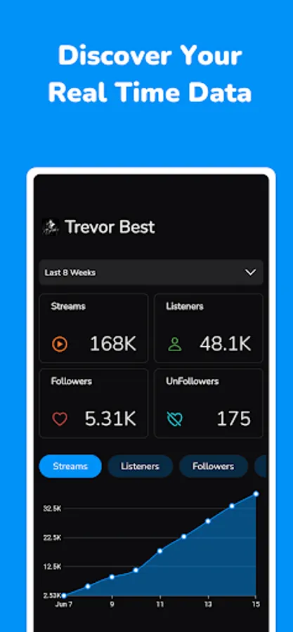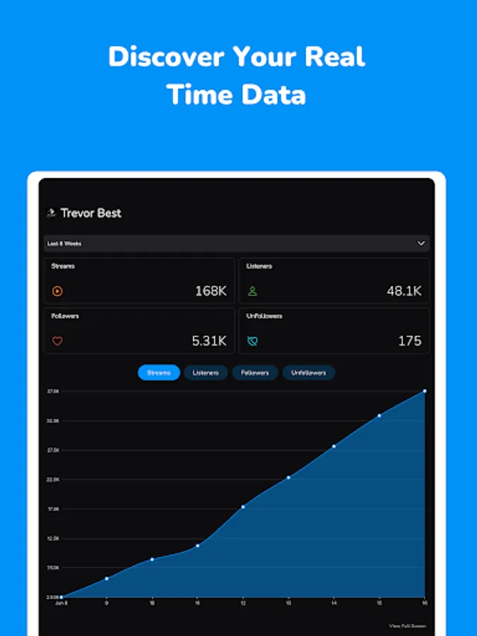• View stream, listener, follower and unfollower count by pre-selected or custom date range.