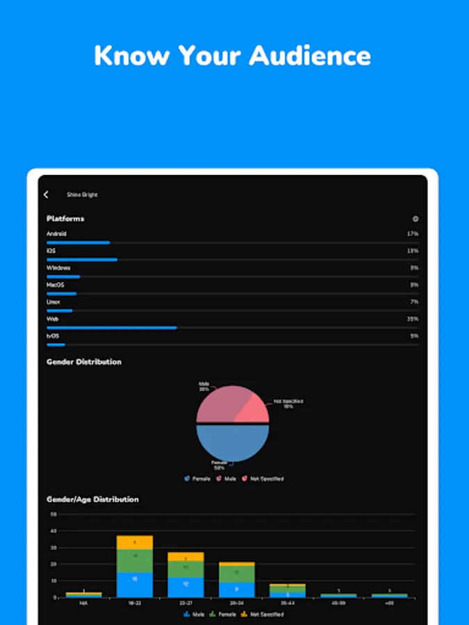• Get insights of your streams and demographics of your listeners including gender, gender/age distribution, and which Playary app platform they use to listen your music.