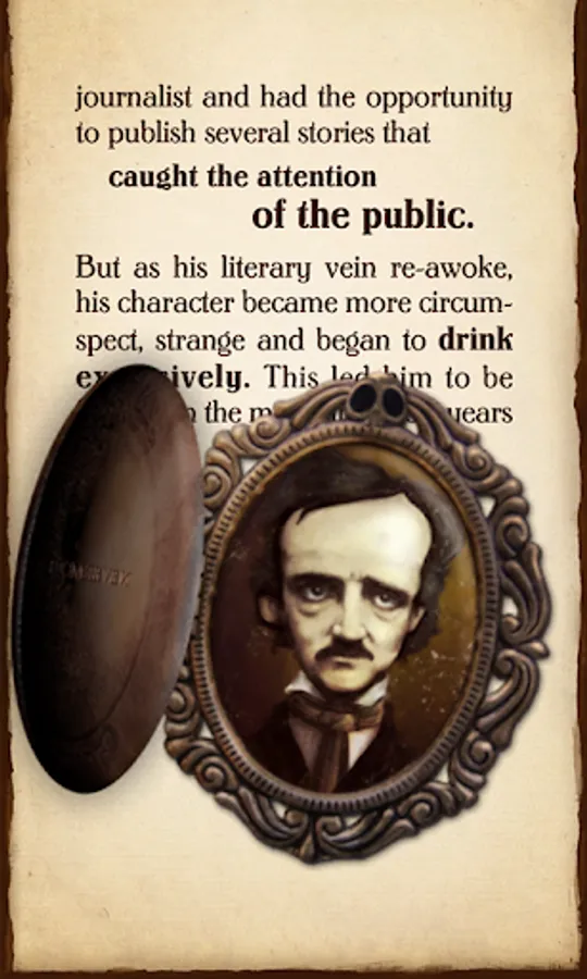By casting a modern glare on a fine selection of Edgar Allan Poe's stories, the result is a spectacular and wholly original experience that utilizes every feature of modern mobile devices (gyro-perspective, flash, vibration).