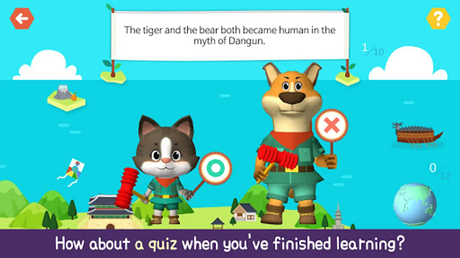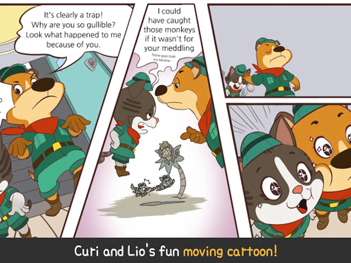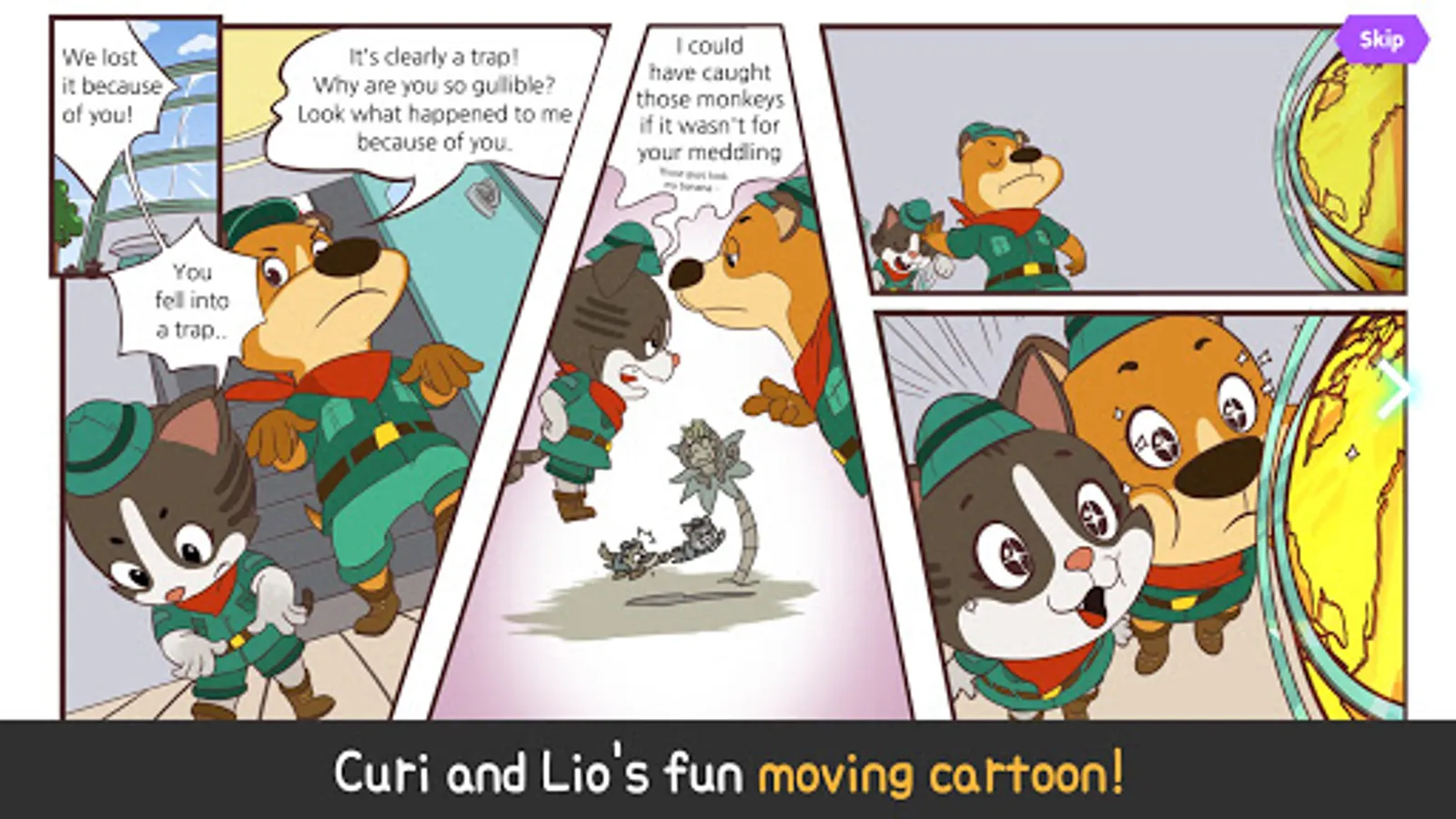 In addition to Curi and Lio's fun moving cartoon, "Curio WorldMap" also features 12 countries of exploration, quizzes, supplementary audio, and many more!