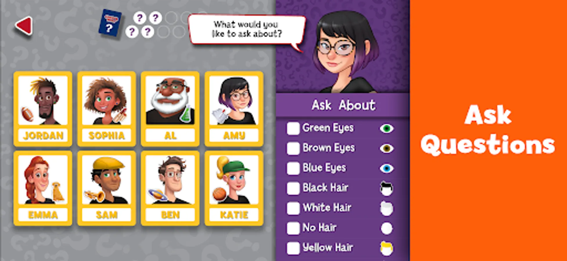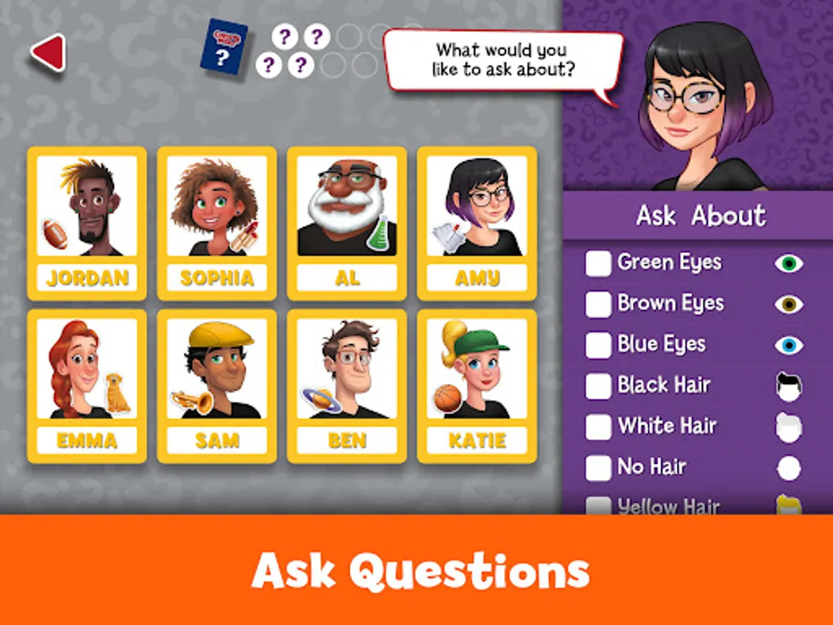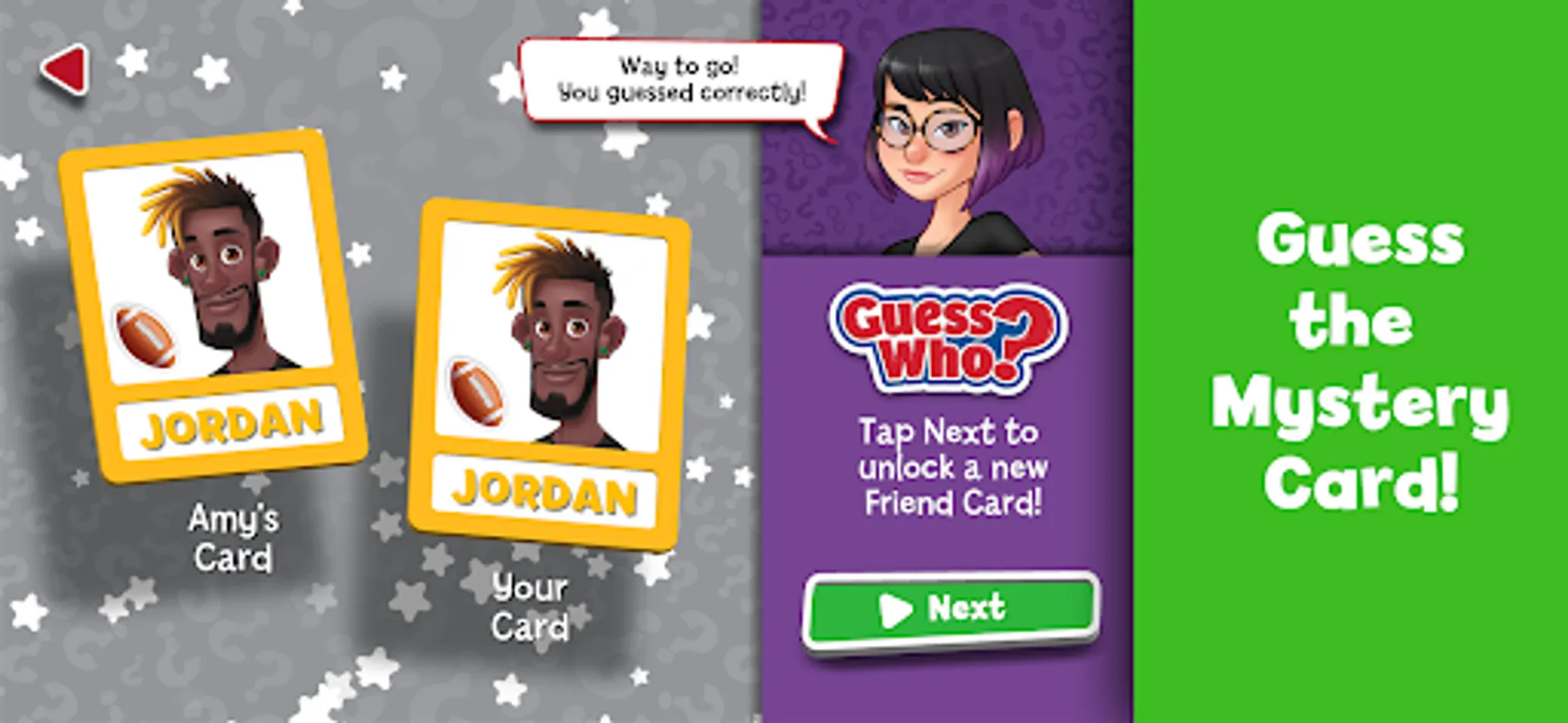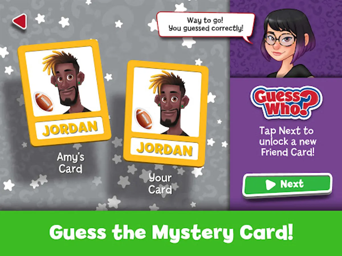 In the GUESS WHO? app, you get to play with each of the 6 classic characters from the board game – Amy, Al, Sofia, Sam, Emma and Jordan - as you try to guess the mystery character using yes or no questions. Do they have brown hair? Do they wear glasses? Do they like sports? Remove cards that don’t match through process of elimination. When you think you know the correct card, makes a guess! The more you more play, the more character cards you will discover. Enjoy fun facts and inspirational messages as you make your way through the app.
