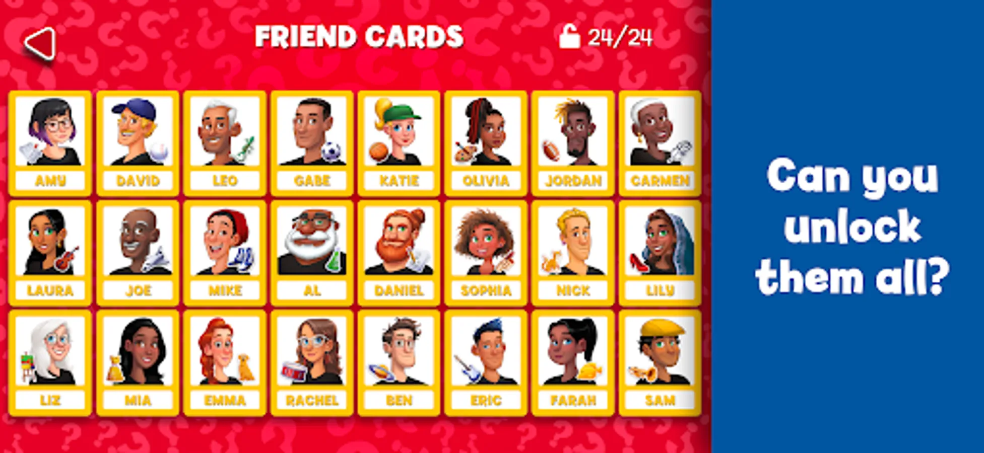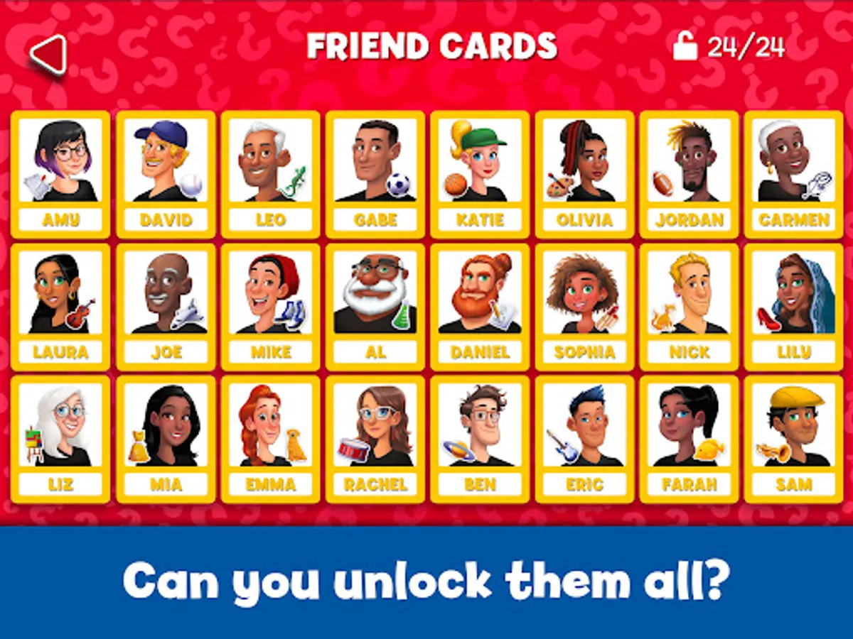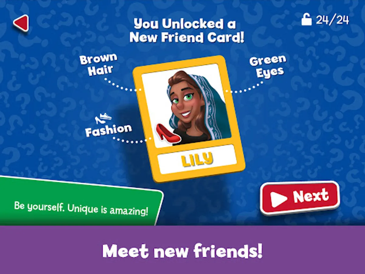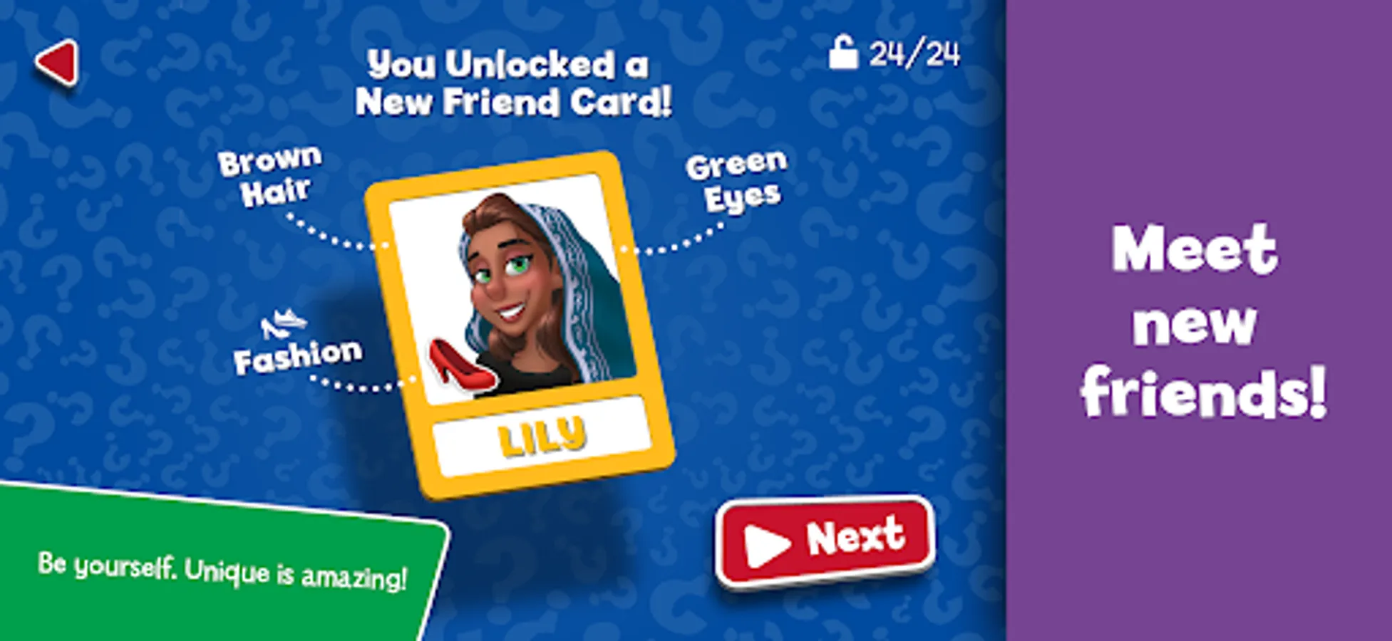 In the GUESS WHO? app, you get to play with each of the 6 classic characters from the board game – Amy, Al, Sofia, Sam, Emma and Jordan - as you try to guess the mystery character using yes or no questions. Do they have brown hair? Do they wear glasses? Do they like sports? Remove cards that don’t match through process of elimination. When you think you know the correct card, makes a guess! The more you more play, the more character cards you will discover. Enjoy fun facts and inspirational messages as you make your way through the app.