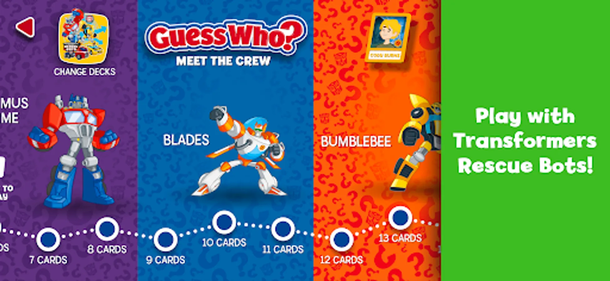For even more fun, you can purchase the Transformers Rescue Bots Deck. For the first time ever play against 6 heroic Autobots: Optimus Prime, Blades, Bumblebee, Boulder, Chase and Heatwave and guess the mystery human or Autobot character they are thinking of! Do they like helicopters? Do they have yellow hair? Are they in the city?