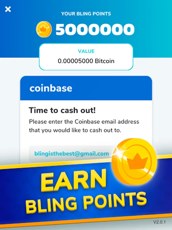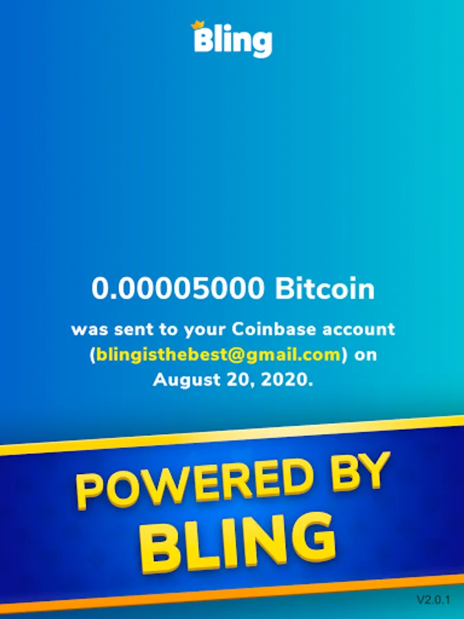 The only requirement is that you register and login before playing. No tricks or hoops to jump through to receive your Bitcoin - just download, register and start playing to start earning Bling Points right away that you can convert to Bitcoin. To convert your Bling Points for Bitcoin, you will need to create a Coinbase.com account.