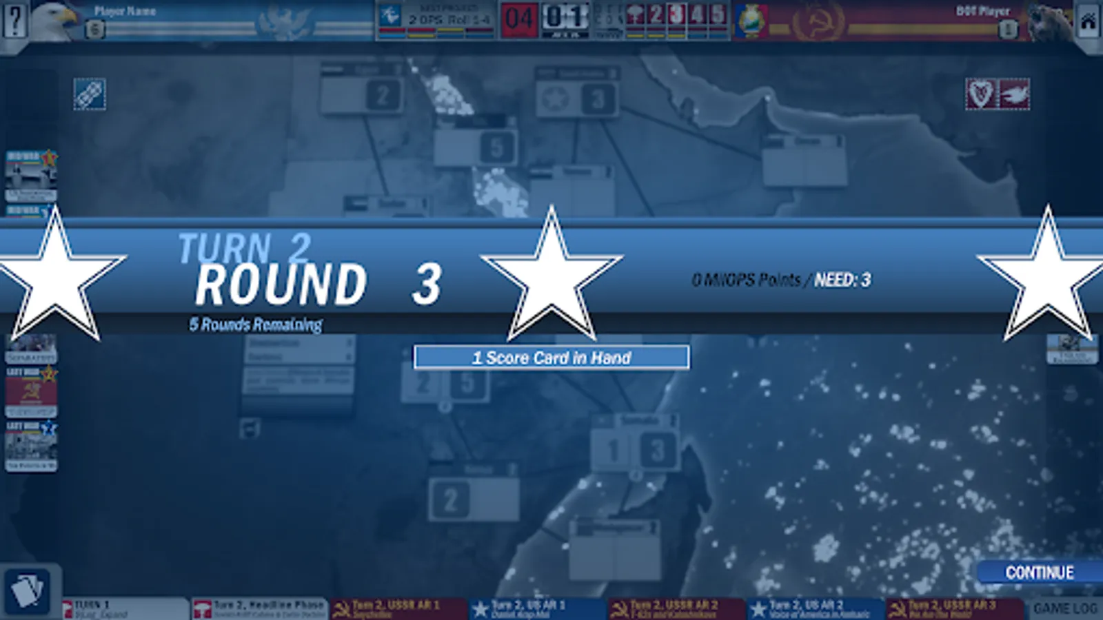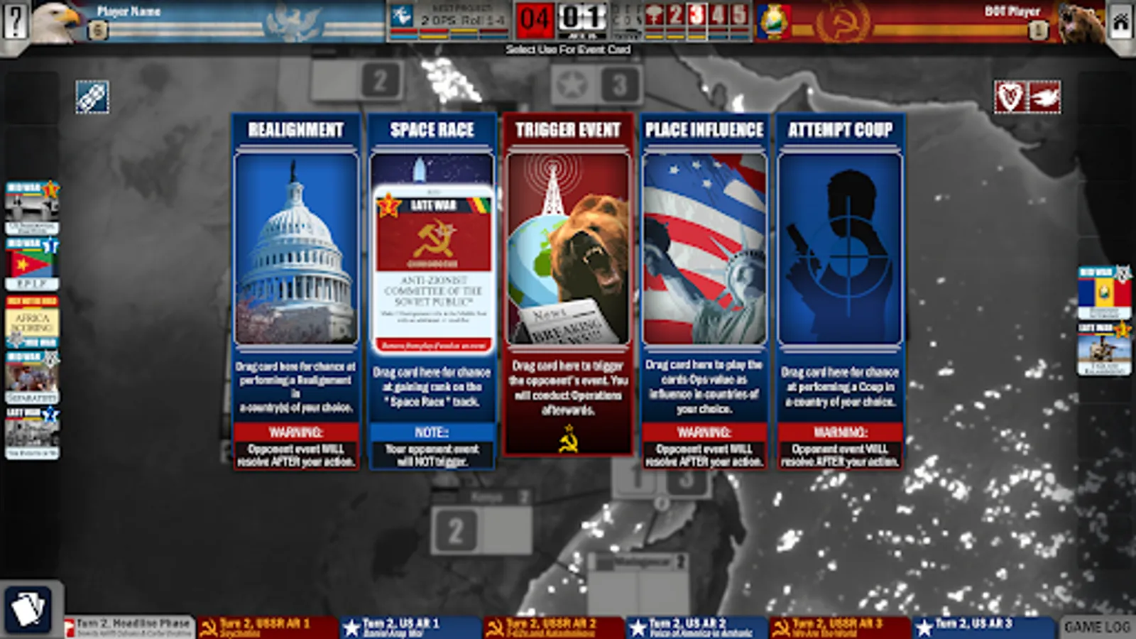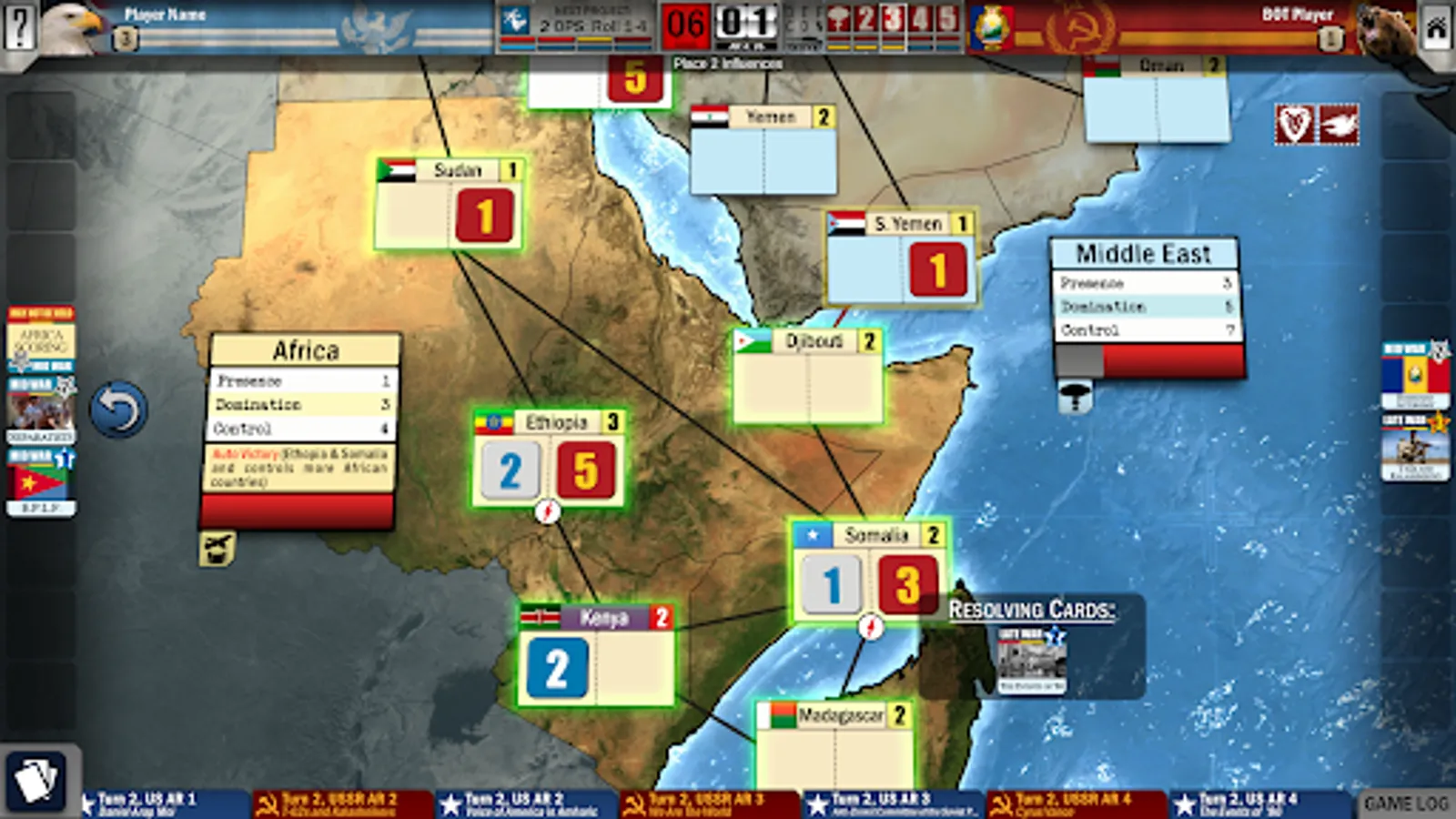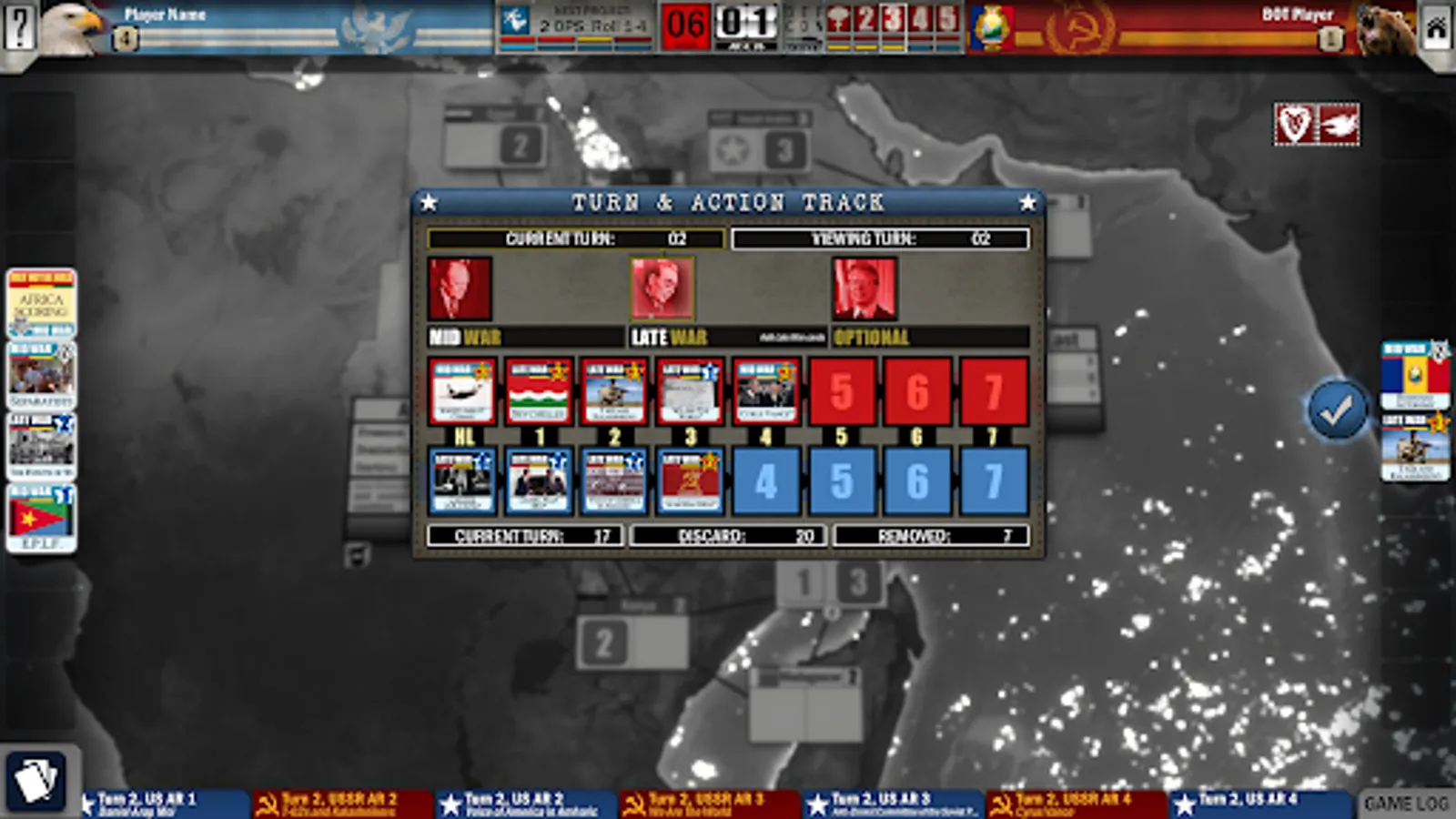 Specific cards from Twilight Struggle can be integrated into Twilight Struggle: Red Sea to add an extra Late War turn to extend the experience. Play the solitaire game via the Solo BOT or take on the challenge of facing the A.I. in offline games.