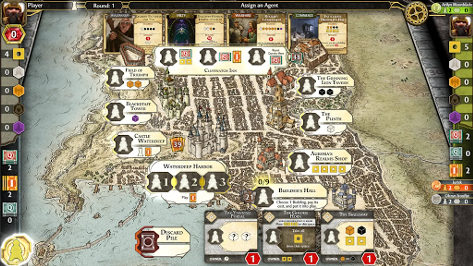 Lords of Waterdeep is a turn-based strategy game played in 8 rounds and can be played against AI or with up to 5 human players. Players take turns assigning their agents to do their bidding, whether it is to recruit new adventurers to their tavern or purchase a new building for the city. Points and resources are gained by completing quests, playing Intrigue cards, constructing new buildings or having other players utilize the buildings you have constructed. At the end of the 8 rounds bonus points are awarded and the player with the most points at the end wins the game.
