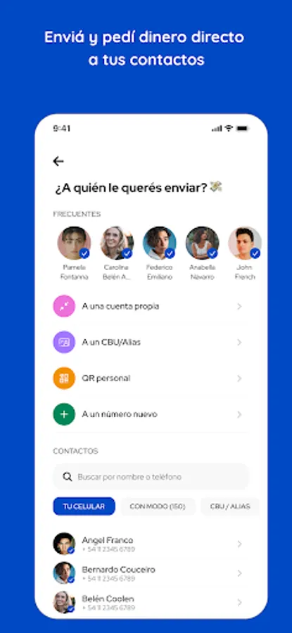 - Send and request money to any of your contacts quickly and safely, through a cell phone number. No CBU or Alias.
