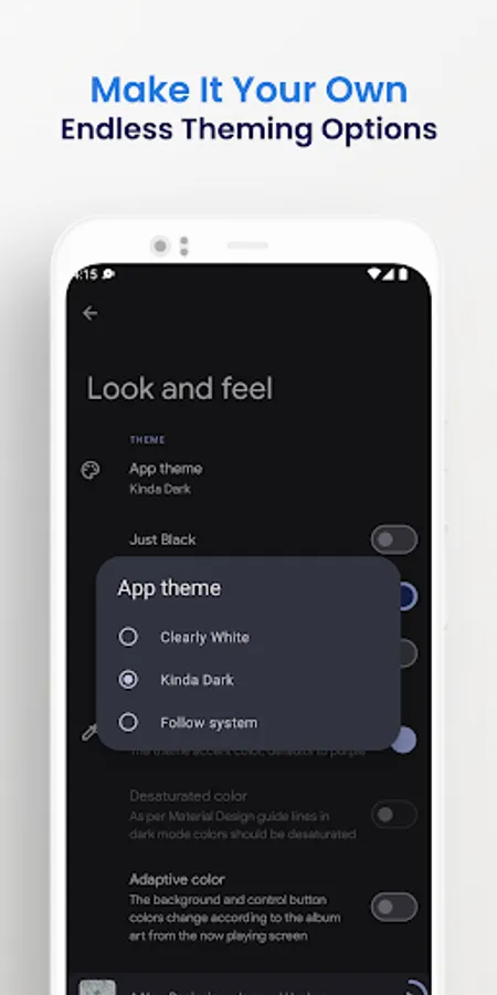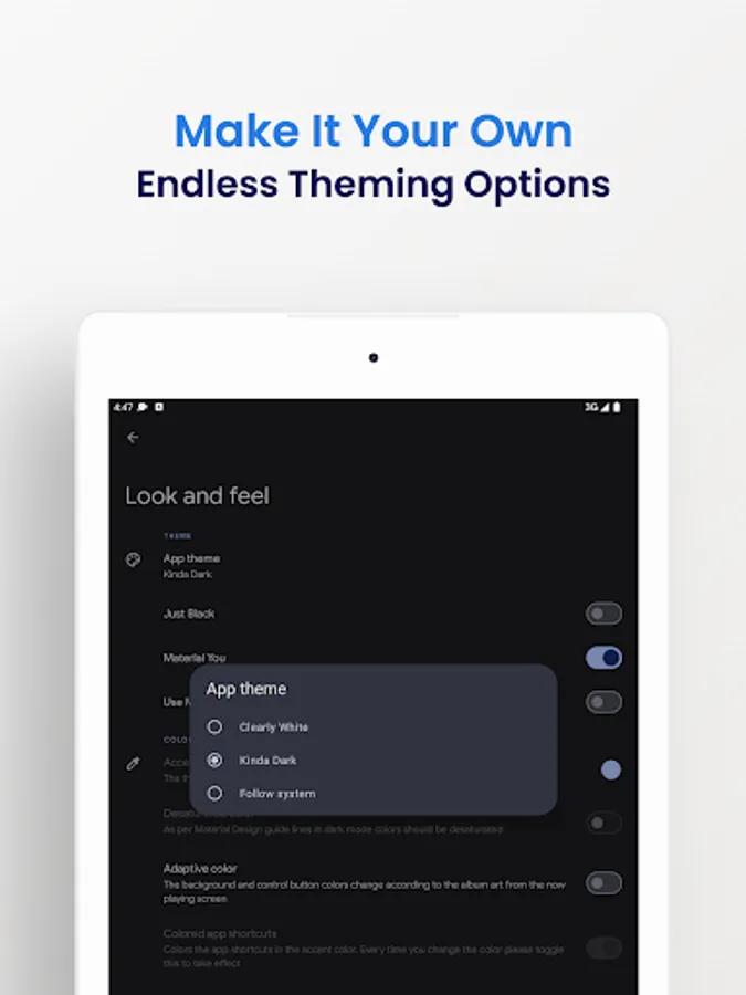 There is an inbuilt theme engine with many different colors to choose from. Plus, the UI colors change dynamically to match the main contents base color.