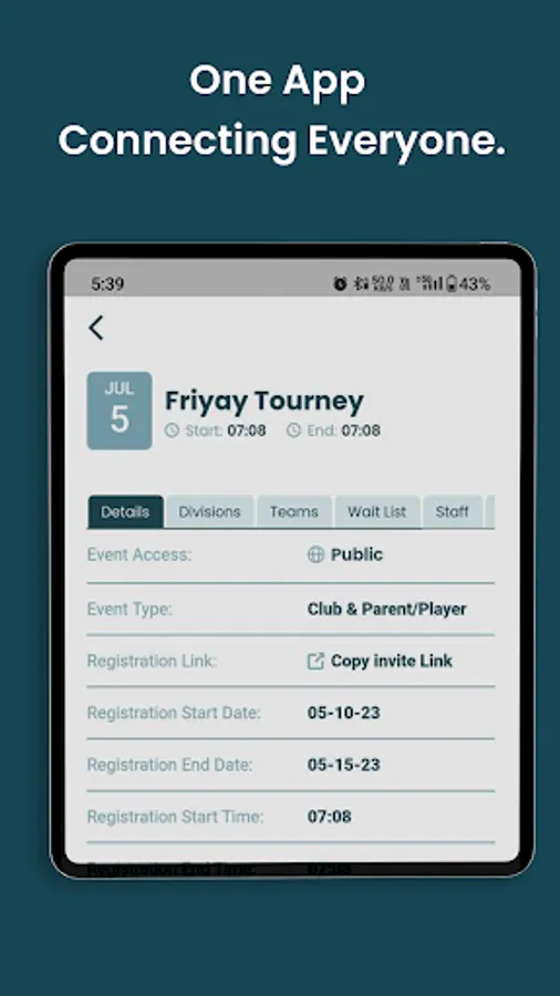 Our platform will simplify the way you connect with event organizers and manage your clubs, teams and players. We’ve automated processes from collecting player info, payments, waivers and RSVPs to registering for events, paying registration fees and submitting rosters. If you host your own events or leagues too, we’ll help you streamline that. You can also communicate everything to your players, parents and coaches right through our platform. And best of all...you can do it from the sidelines, your hotel room, or your couch!