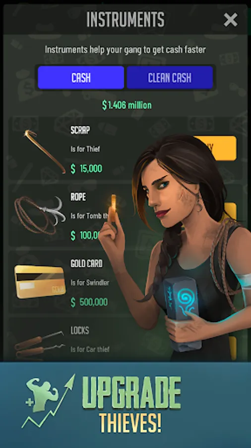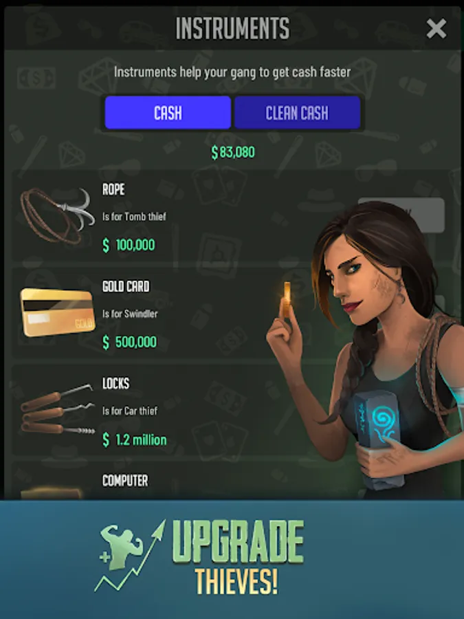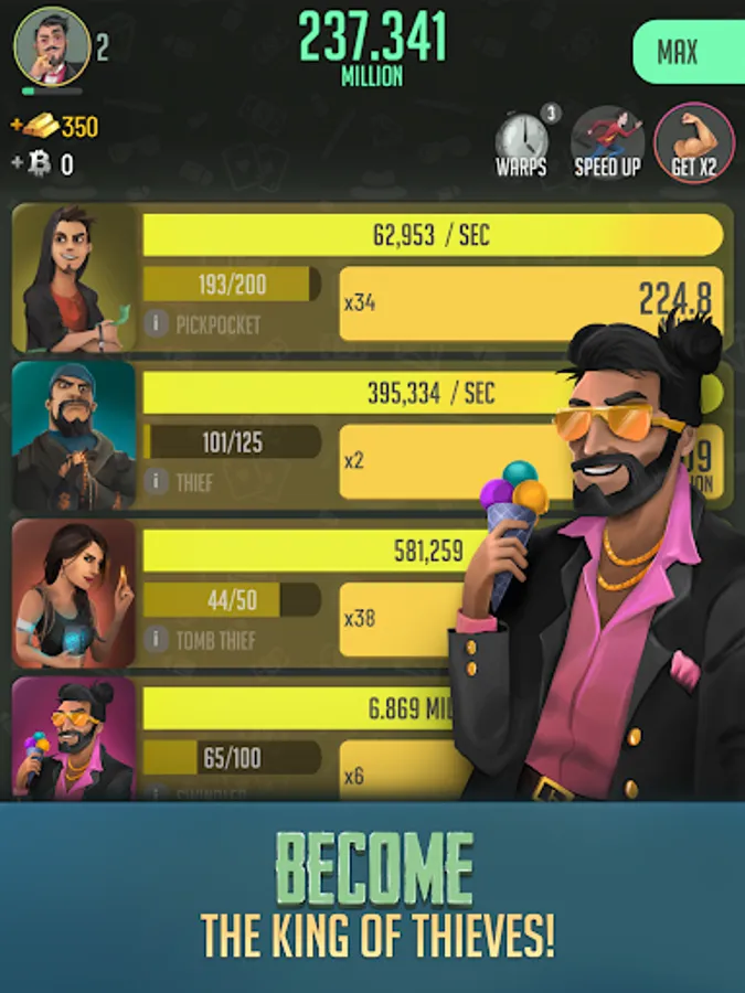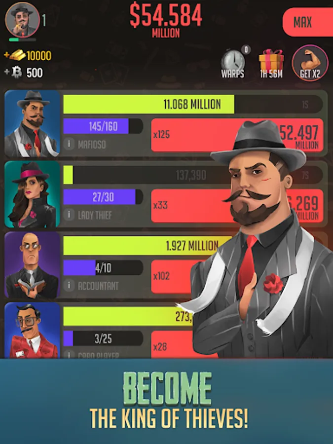 Ever dreamed of owning incredible team earning big money for you? Becoming a capitalist tycoon and just a Big Boss? Then Idle Thieves is the idle clicker for you!