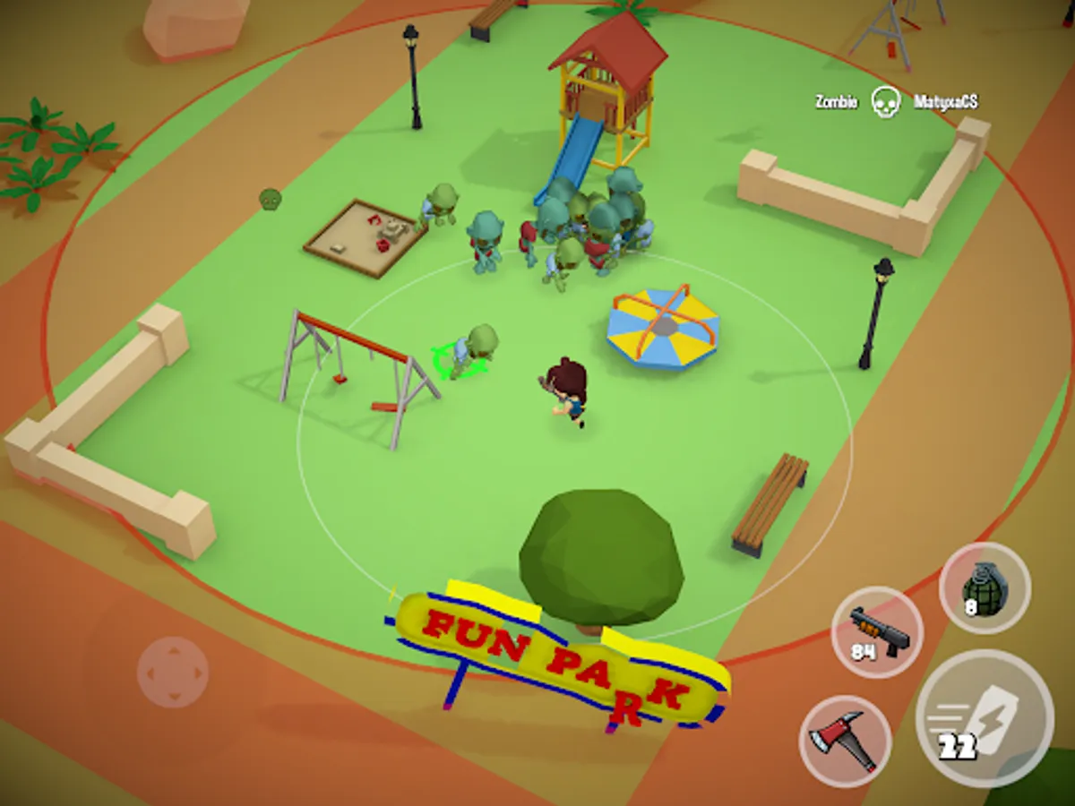 Survive in the apocalypse city, desert, forest, farm and military base. Use a wide variety of improvised items in a battle with zombies and players! Axes, pitchforks, construction tools, guns, grenades, chemical weapons, body armor, flying shoes, fast food, first-aid kits and much more! Grab whatever you want and try to survive among zombie and other hunters even offline!