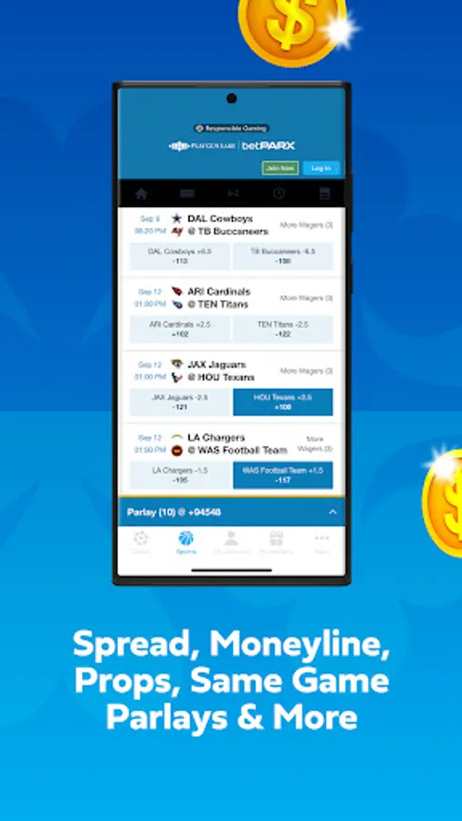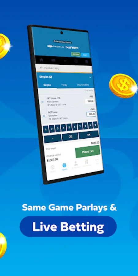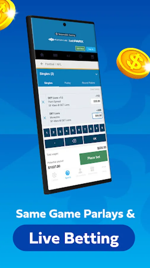 Bet Over-Unders, Parlays & Same Game Parlays, Futures, Live, or Spread Bets on the Sportsbook.