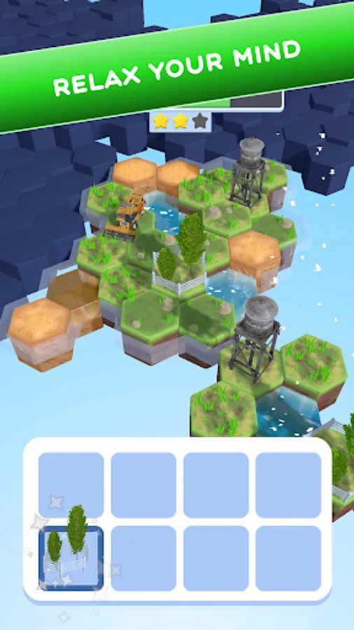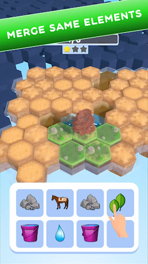 Merge items to create larger ones and transform desert tiles into lush green landscapes. Strategically place your creations on the map to unlock new areas. Complete the entire map to win and witness the desert's transformation into a thriving paradise. Can you become the ultimate Terraformer?