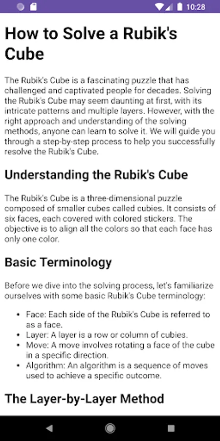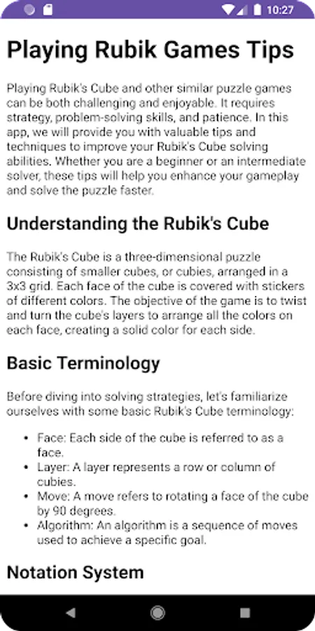 With a sleek and intuitive interface, Playing Rubik Games Tips offers a user-friendly experience right from the start. Upon launching the app, users are greeted with a wide range of resources to enhance their Rubik's Cube-solving skills. The app encompasses various sections, each catering to different levels of expertise.