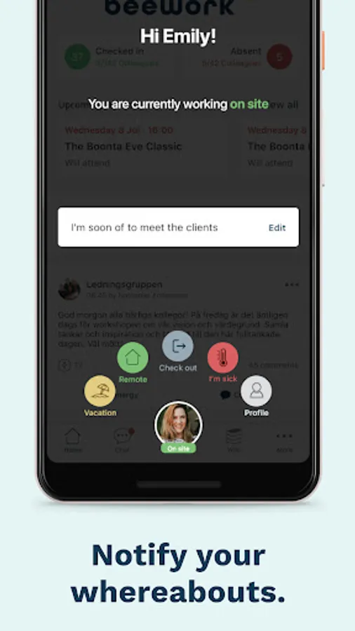 With the Availability function, you can easily notify your colleagues if you are available or not and can even notify that you, for example, are working from home. If you are ill, you can change your status in the app and the information is shared to everyone concerned.