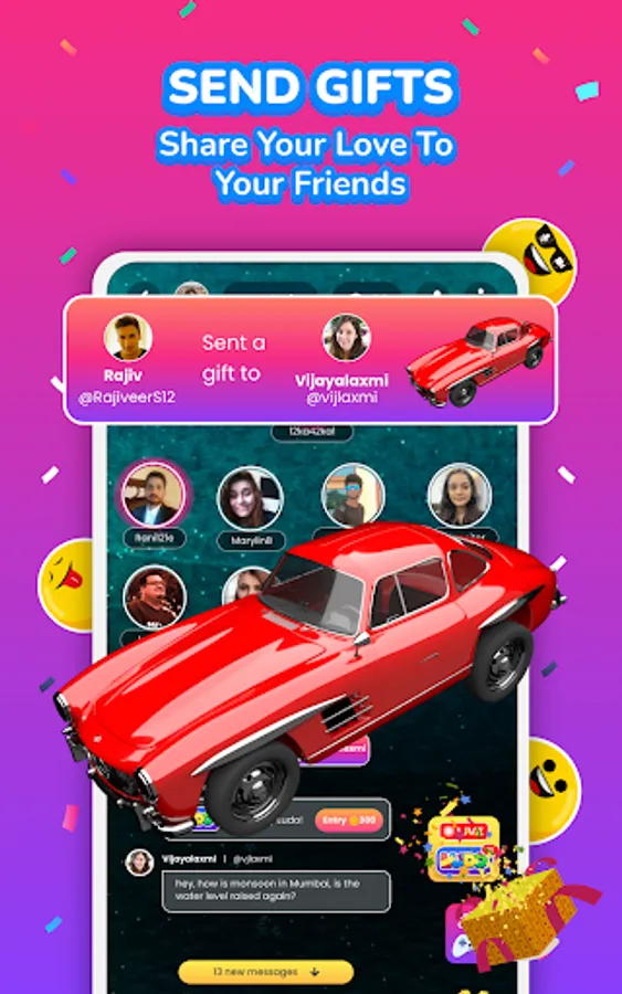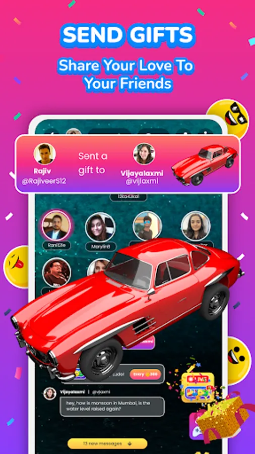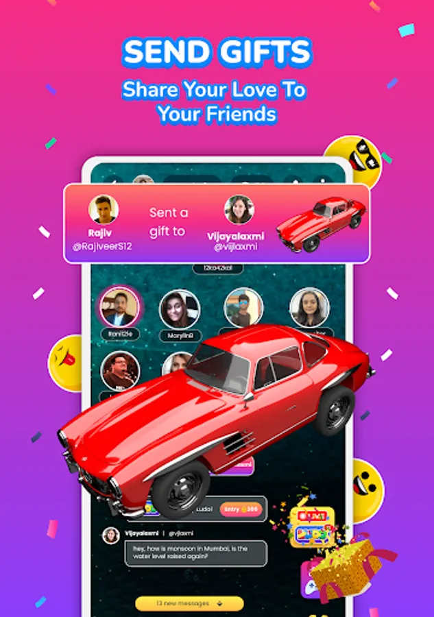 Send/receive gifts in live chat rooms, individual chat, Circles and also during gameplay. You can send gifts such as Roses, Golden Roses, Teddy Bears, Beer Mugs, and so on.
