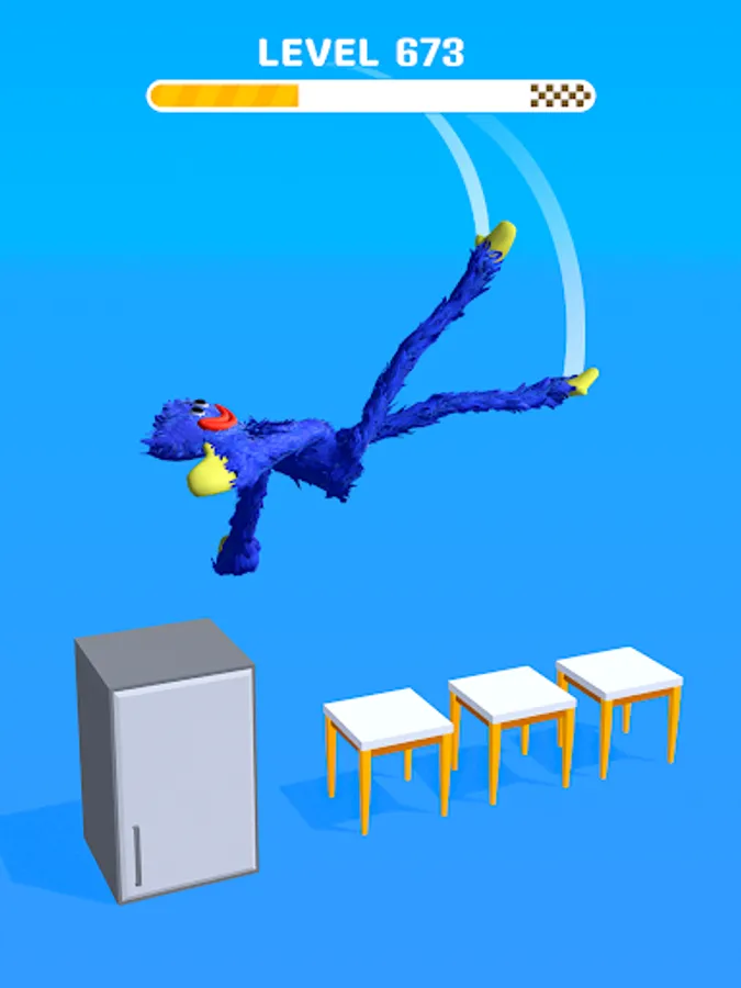 Explore rooms with different furniture like tables, chairs, bottles, shelves, freezers, lamps, and other obstacles that can get in your way to bed. Flip the ragdoll body over anything like doing a water bottle flip.