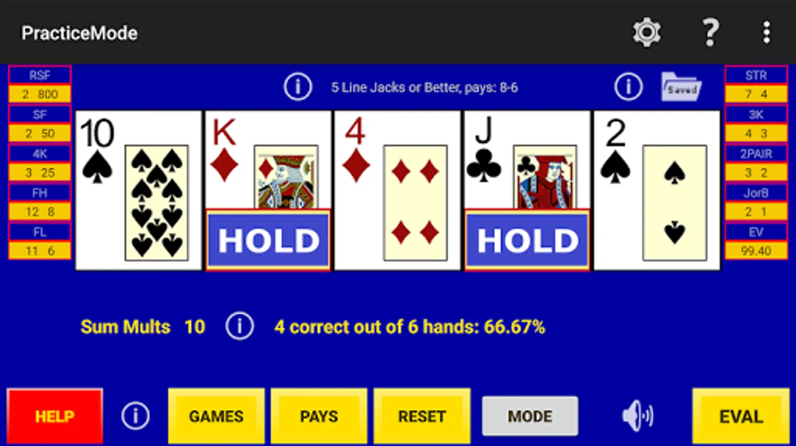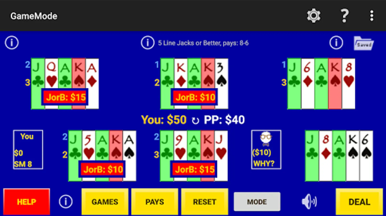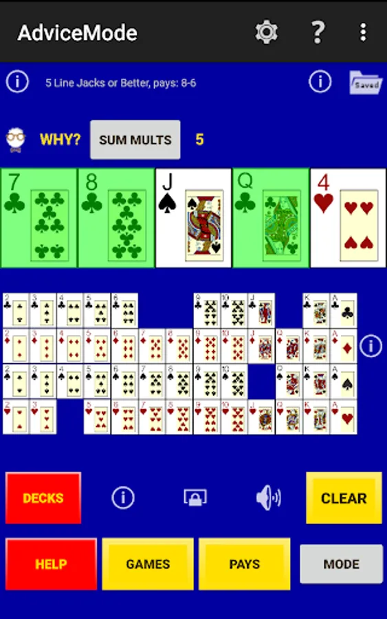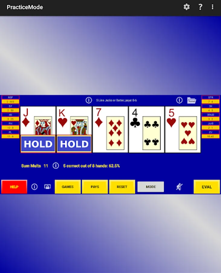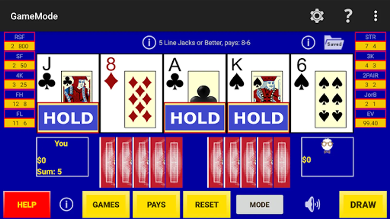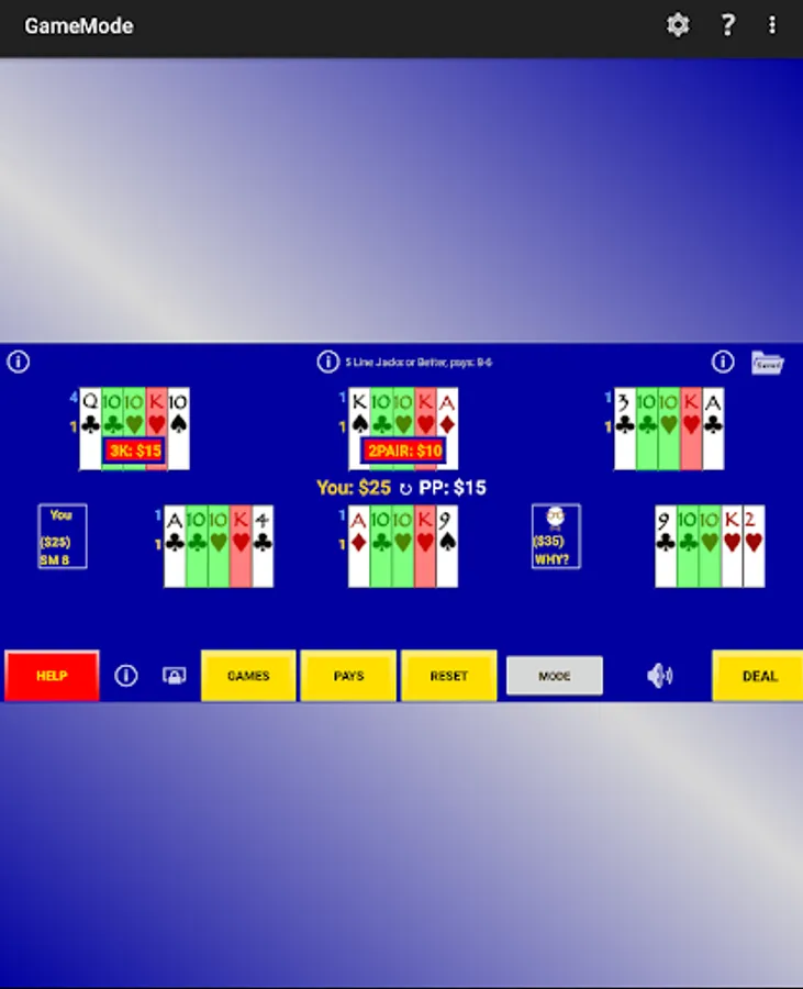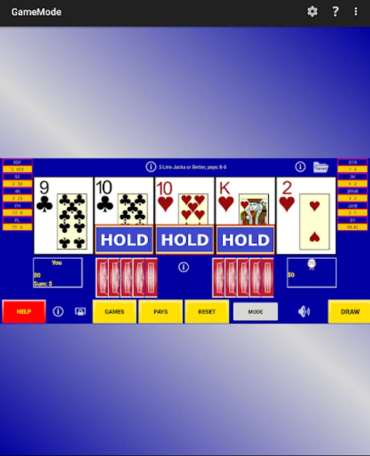 Game Mode - a player just plays the game for fun where random cards are dealt, the player selects hold cards, a draw is made and any payouts recorded. The same draws are used to fill-in a perfect hold hand for comparisons so one can learn perfect play as they go.