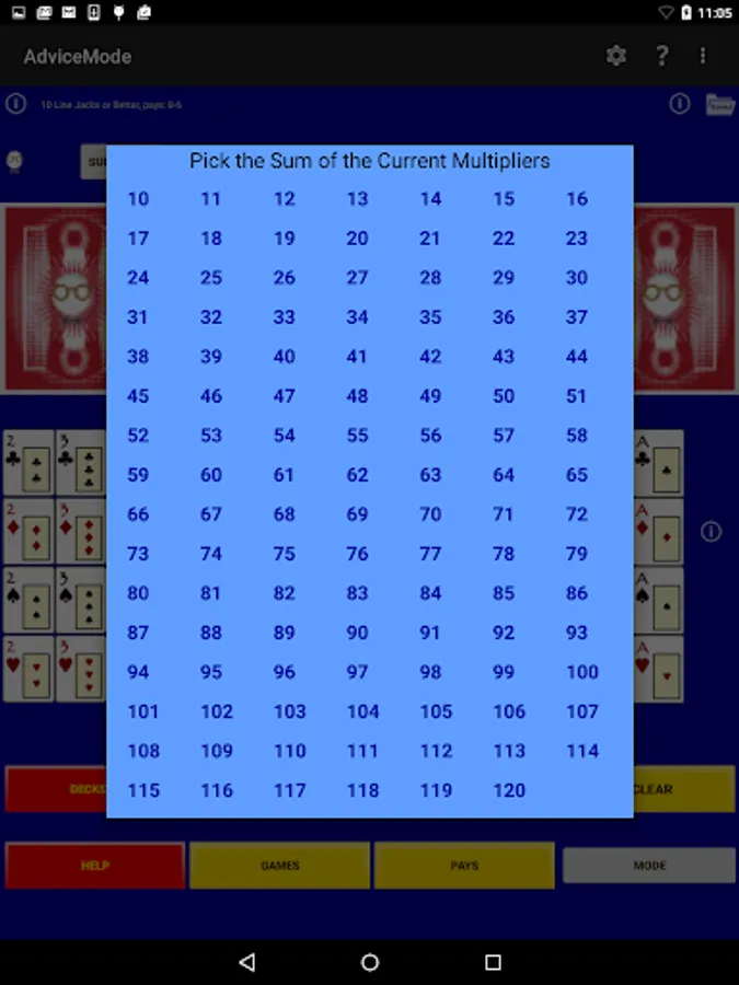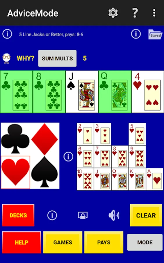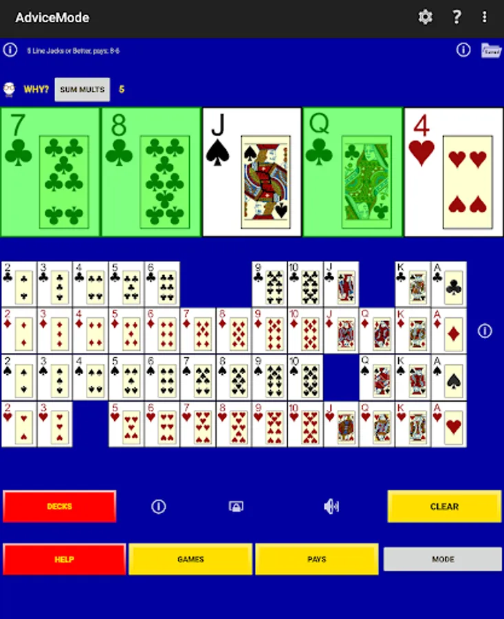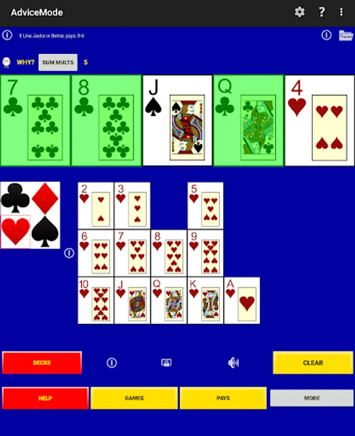 Perfect Hold Advice - select five cards from a deck and a sum of the current multipliers and this app shows a perfect hold hand, that is, the cards to hold that maximizes the average or expected long-run payouts. (Some hands have more than one optimal play and you set the criteria to break the ties. These hands are indicated.)