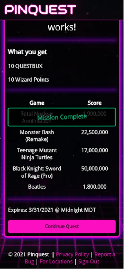 PINQUEST Pinball is here to give you a new and exciting way to play your favorite pinball games! Launch the app to see what local or national quests are available! Earn Wizard Points to go towards your national ranking.