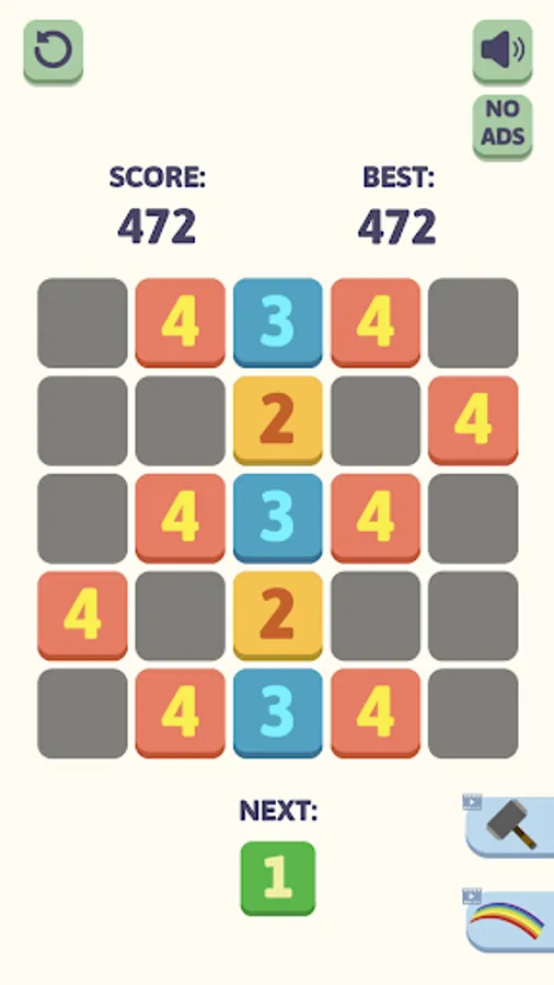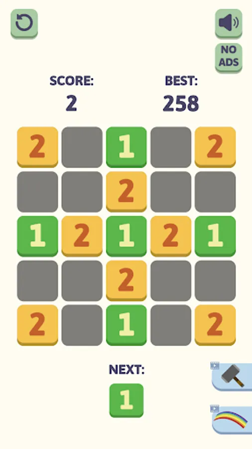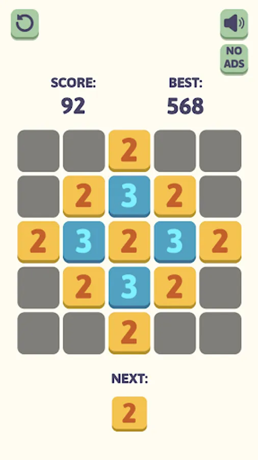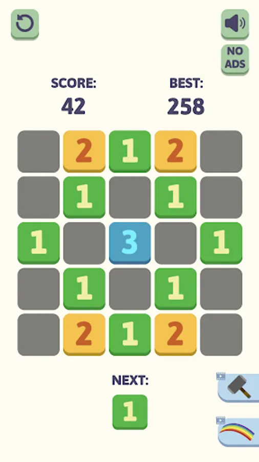 Merge numbers by adding tiles with the same number to the field next to already placed tiles (vertically or horizontally).